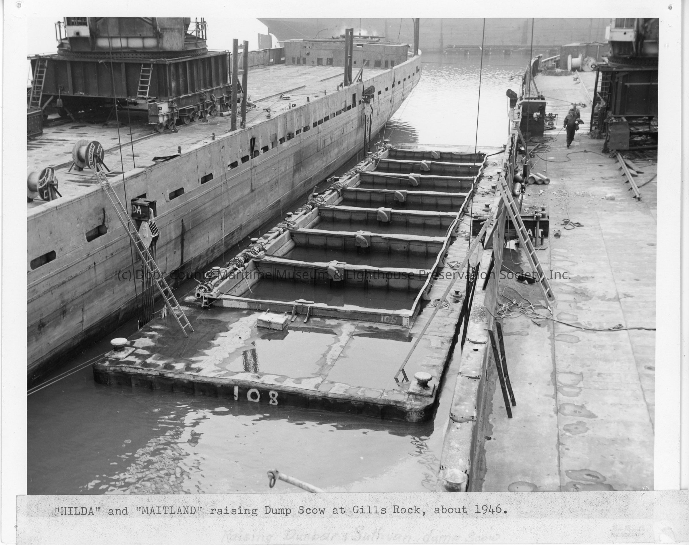 Hilda and Maitland raising dump scow at Gills Rock 1946Entry/Object ID