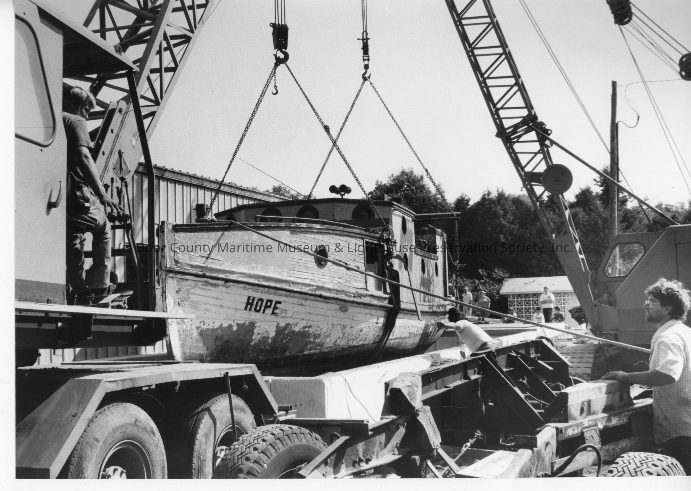 Hope in hoist being placed at Door County Maritime Museum Gills Rock 1992Entry/Object ID