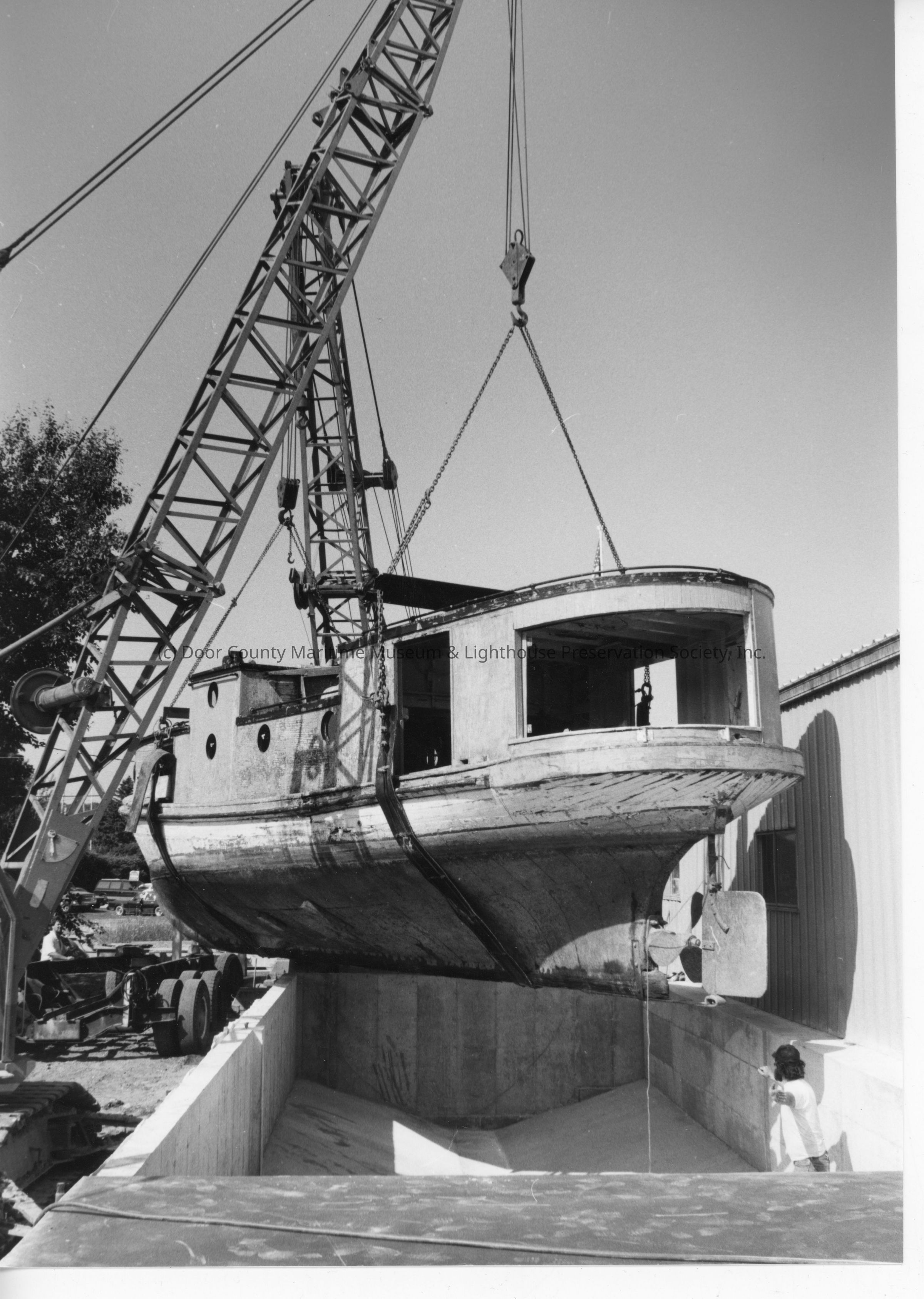 Hope on crane being place at Door County Maritime Museum Gills Rock 1992Entry/Object ID