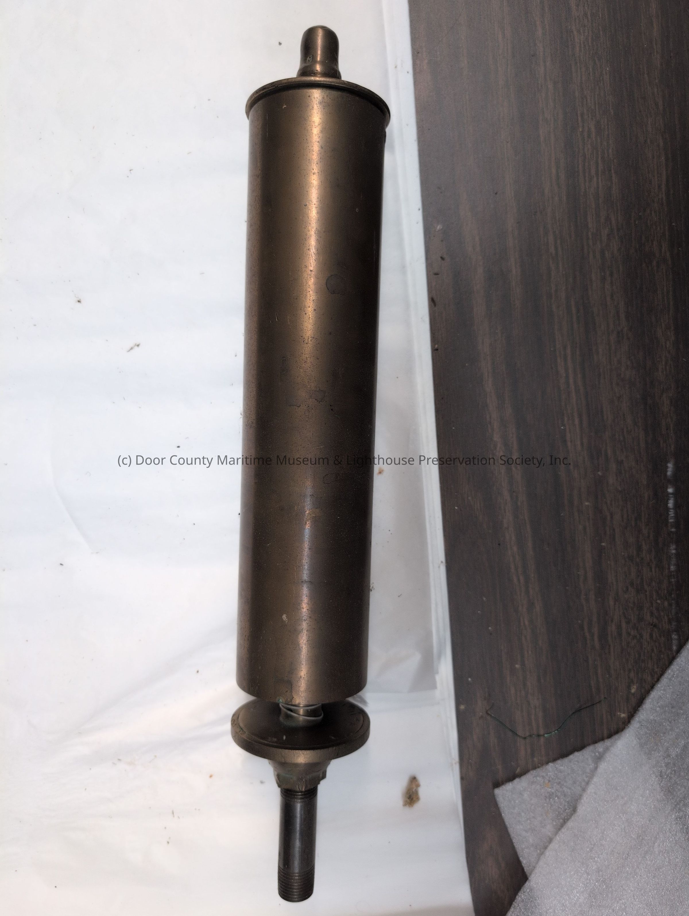 Bronze metal steam whistle. Cylindrical. Bottom has silver screw attached