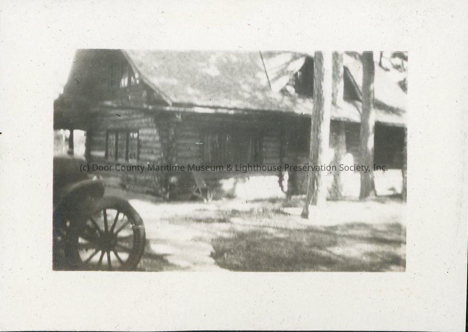 The Hotz family Europe Lake cottage in May 1924. The front end of a vehicle is visible to the left.Location