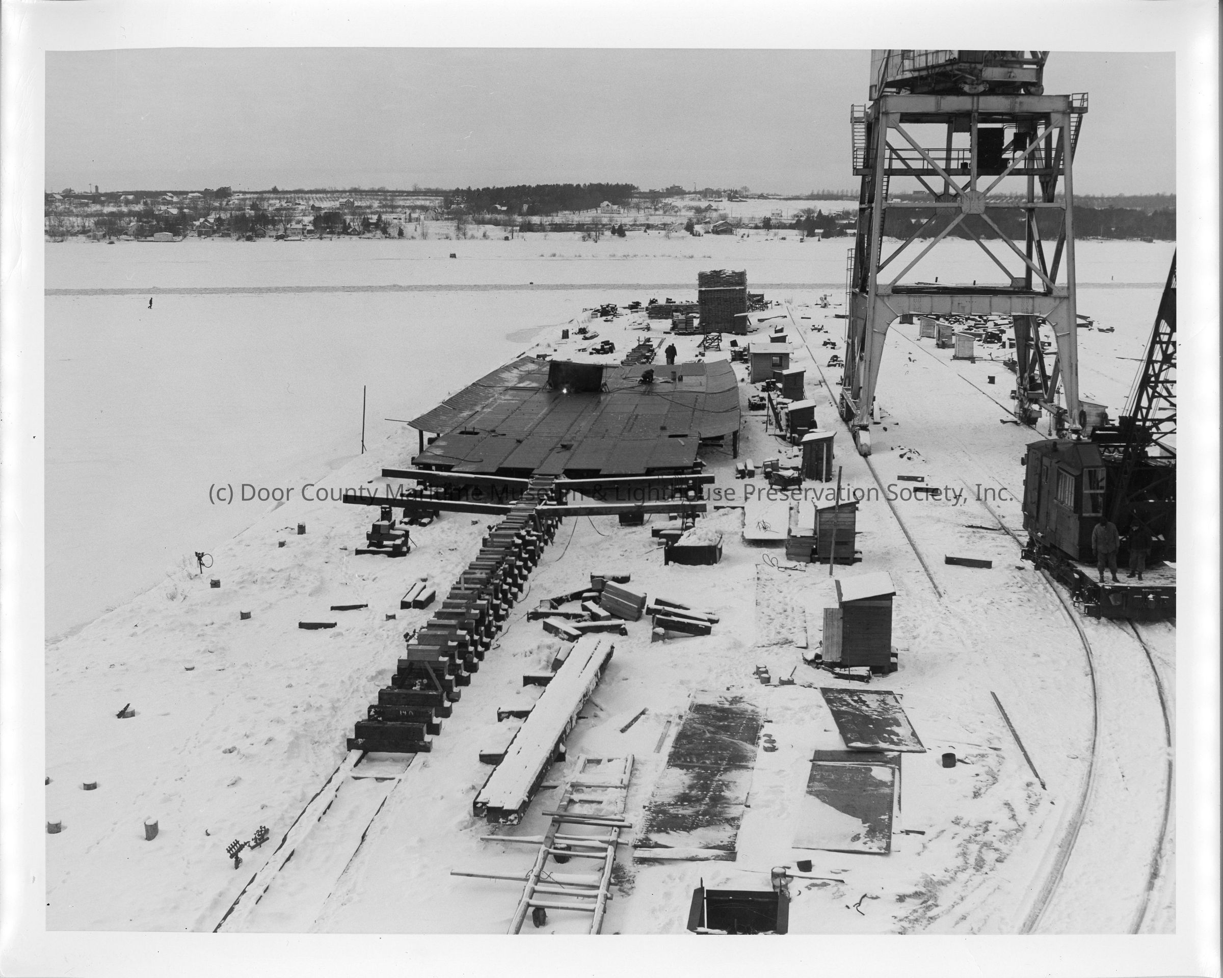 Hull of Spartan under construction in snow January 9, 1951Entry/Object ID