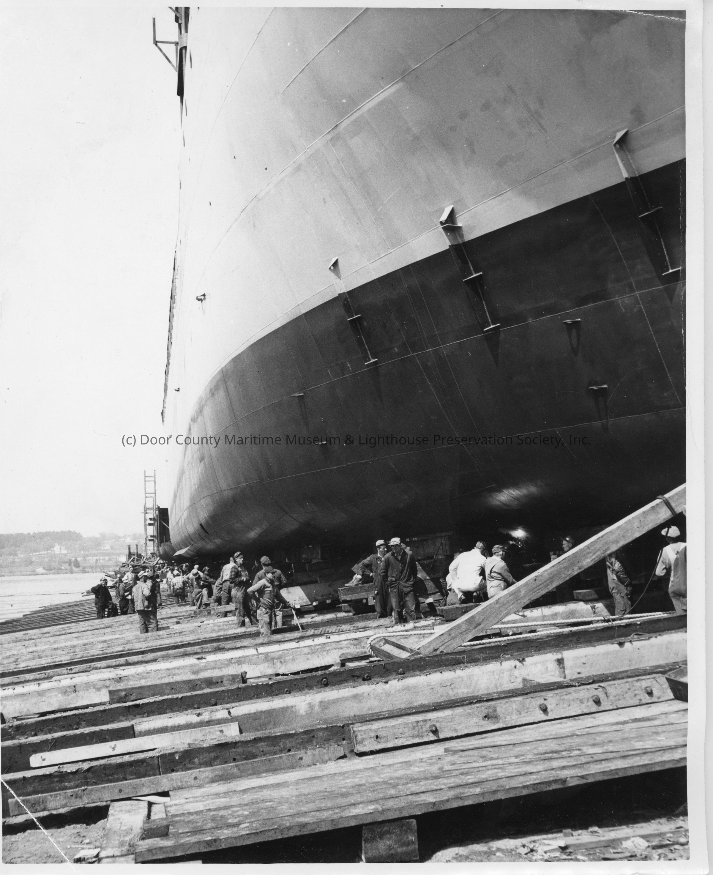 Hull on skids with workmen nearby at Leathem D. Smith ShipbuildingEntry/Object ID