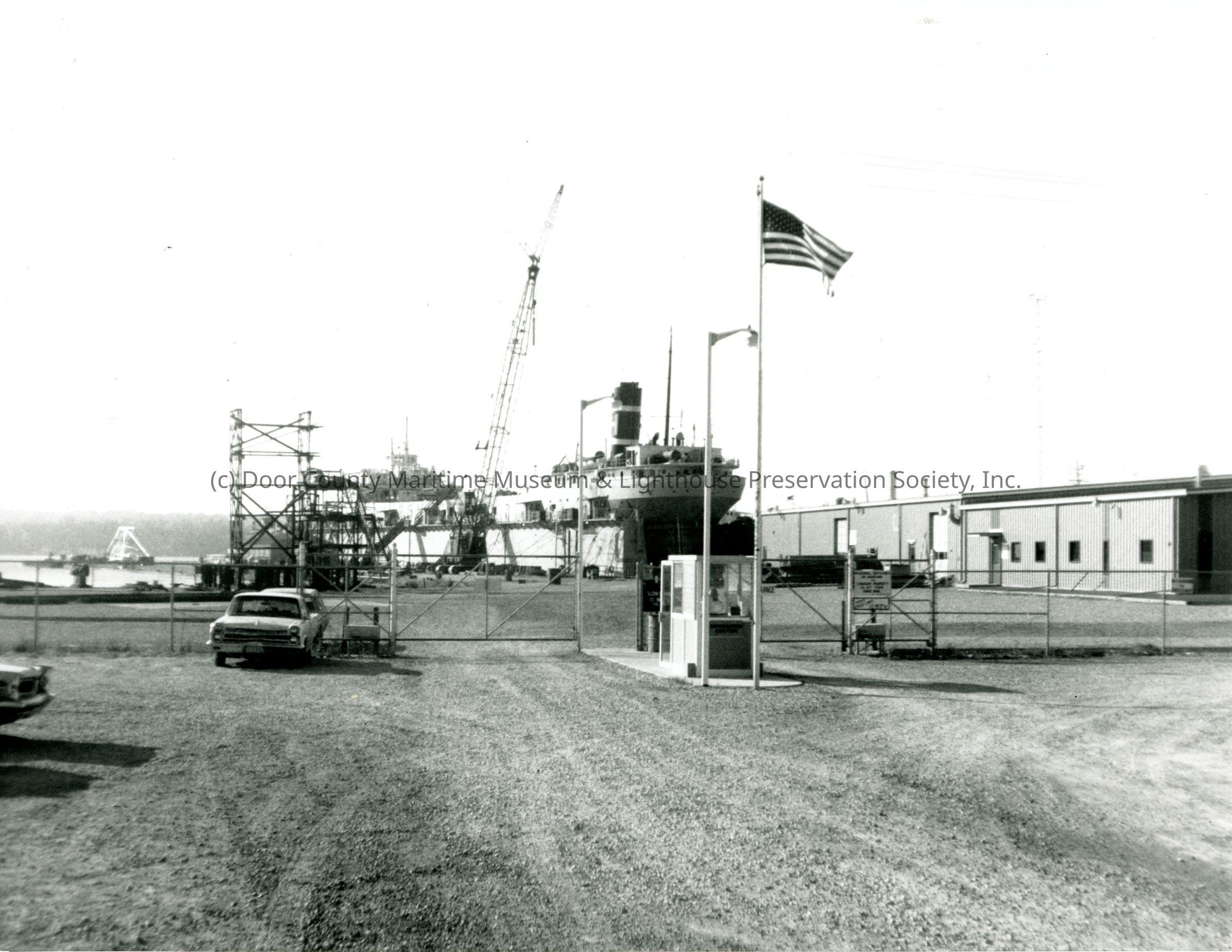 Huron Cement Co. cement boat S. J. Crapo in drydock at Bay Shipbuilding for repairs 1974