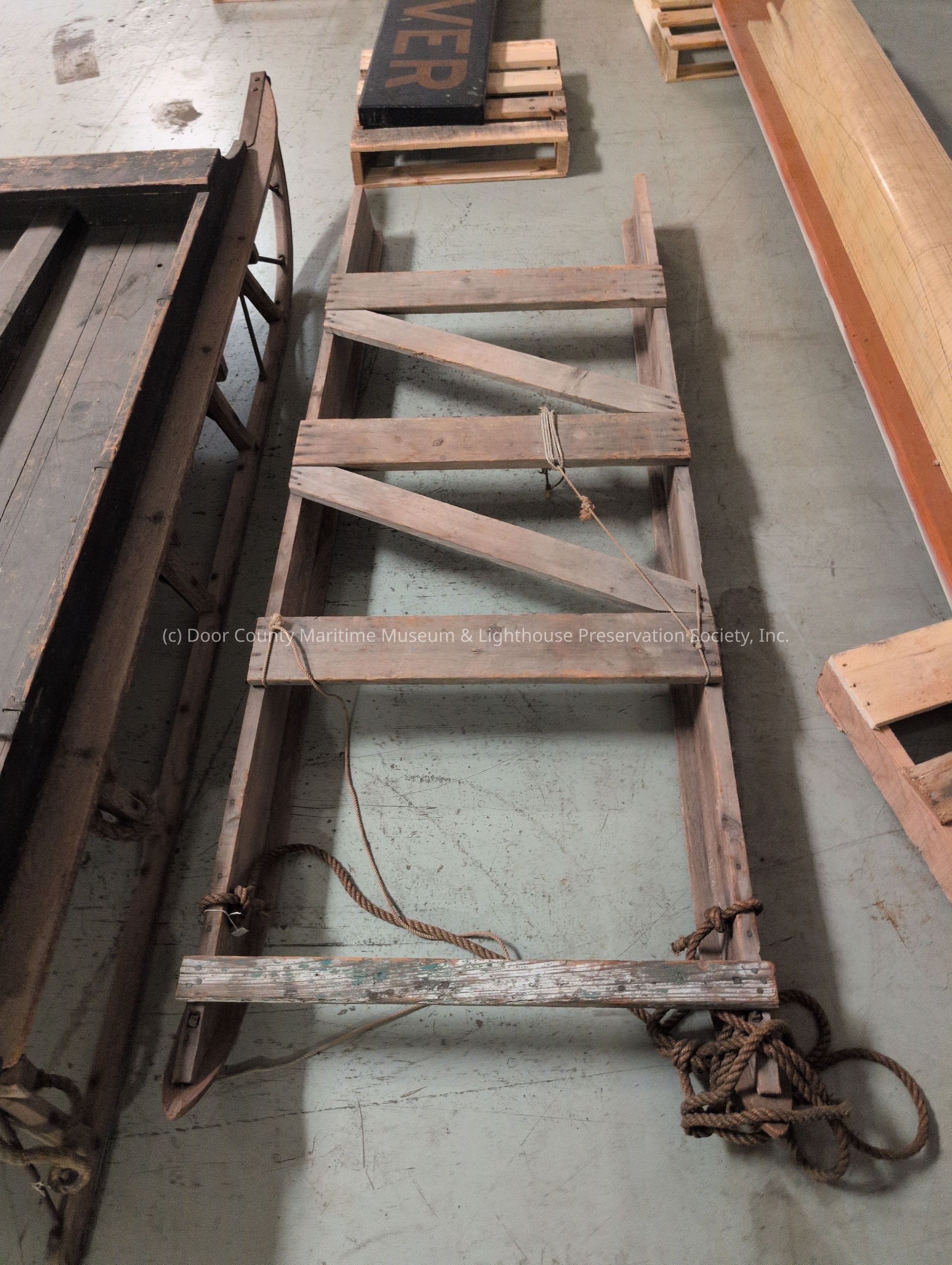 Brown wooden ice sled. Object is weathered. Several pieces of rope line attached.