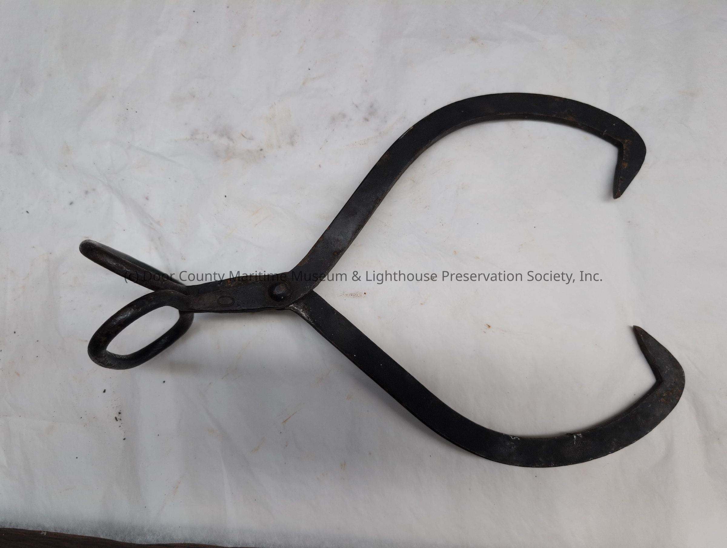 Black metal tongs. Handles are oval in shape. Tongs are flat with some spots of corrosion.