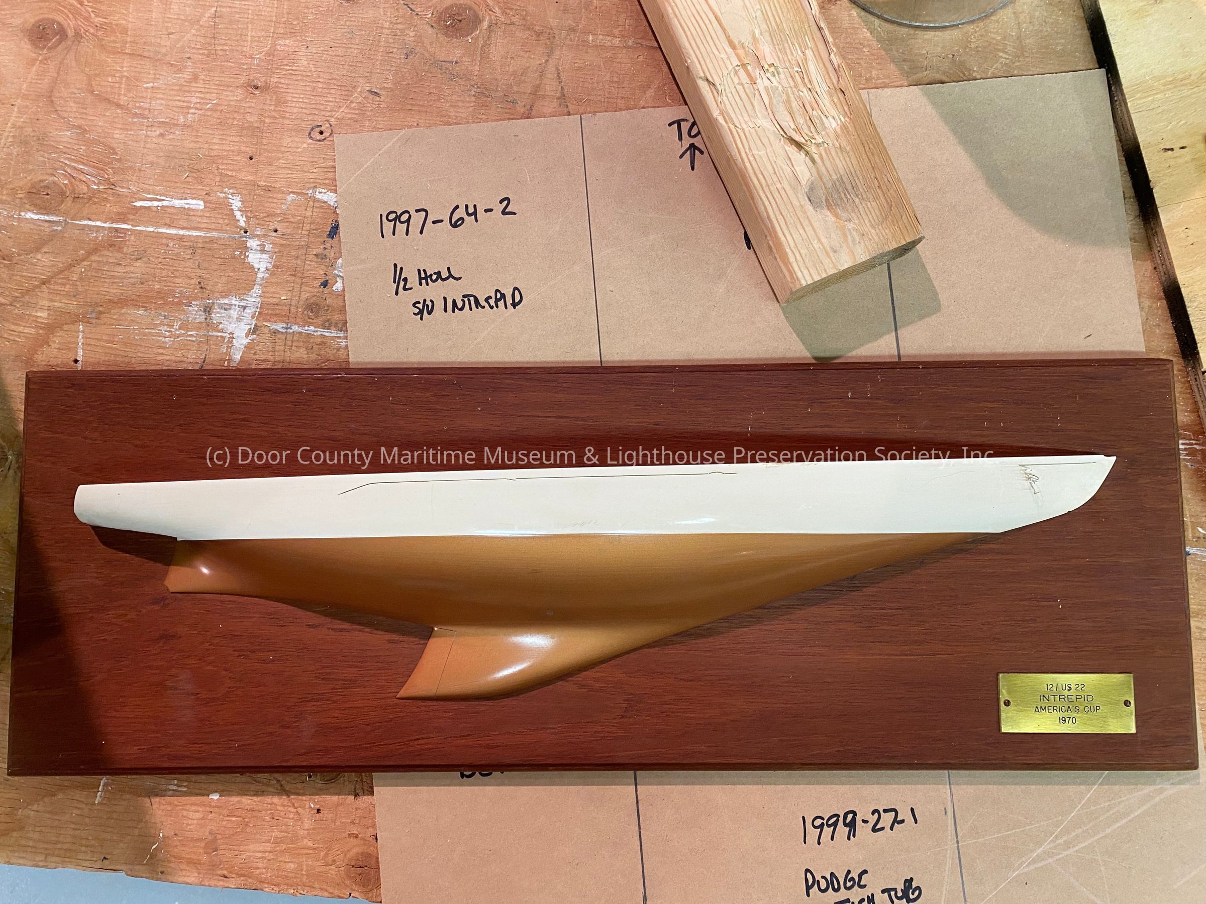 Half hull model of "Intrepid": on varnished display board; gold plate on bottom right engraved "12 US22 Intrepid America's Cup 1970"; model is 24"L x 5.5"H x 2.5"W; copper-colored botttom half; white on top half; gold stripe is "broken"; piece broken off white at stern; wire hanger on back for hanging.