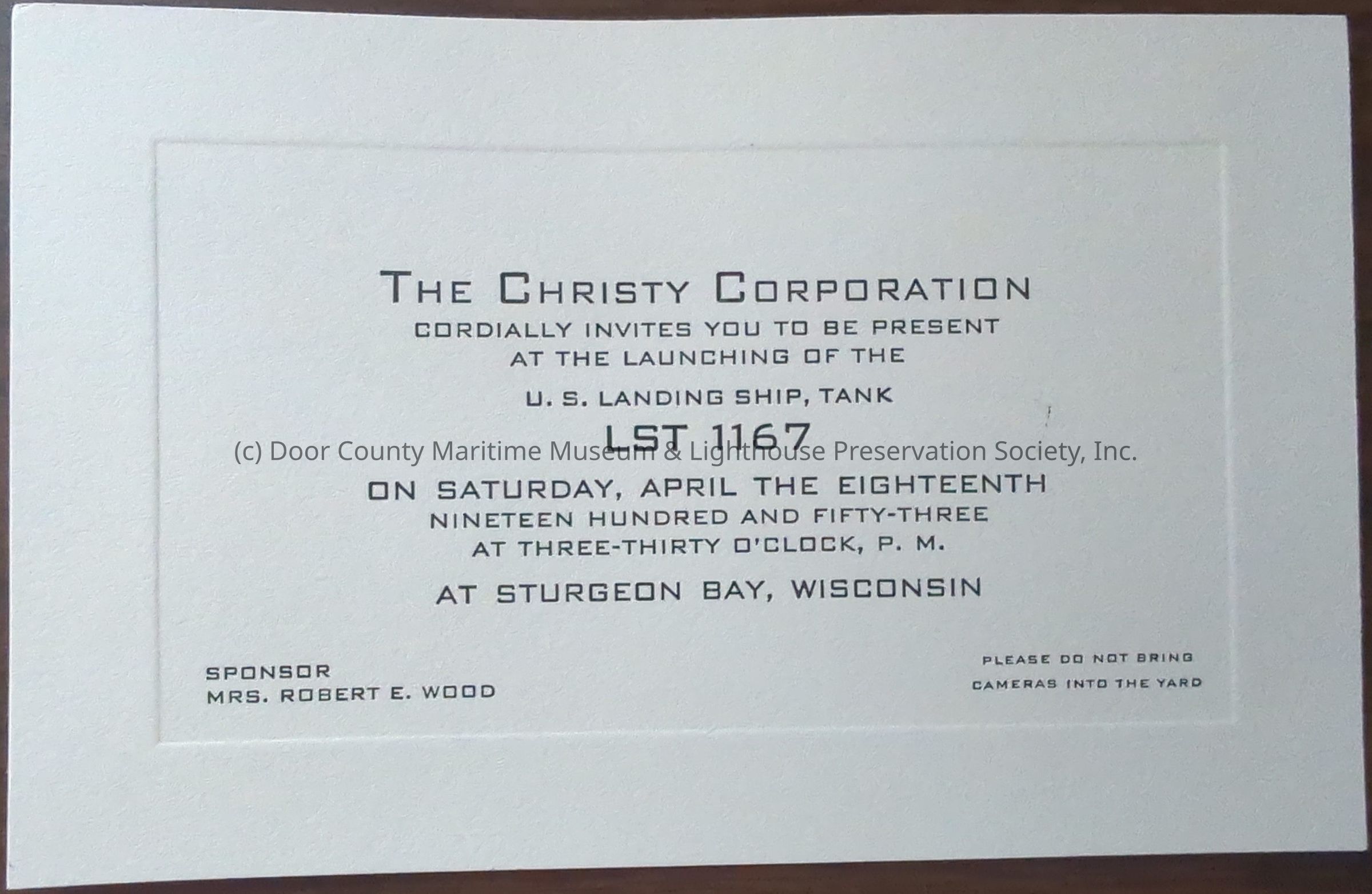 White paper with black print. Christy Corporation invitation to launching of LST 1167, April 18,1953Location