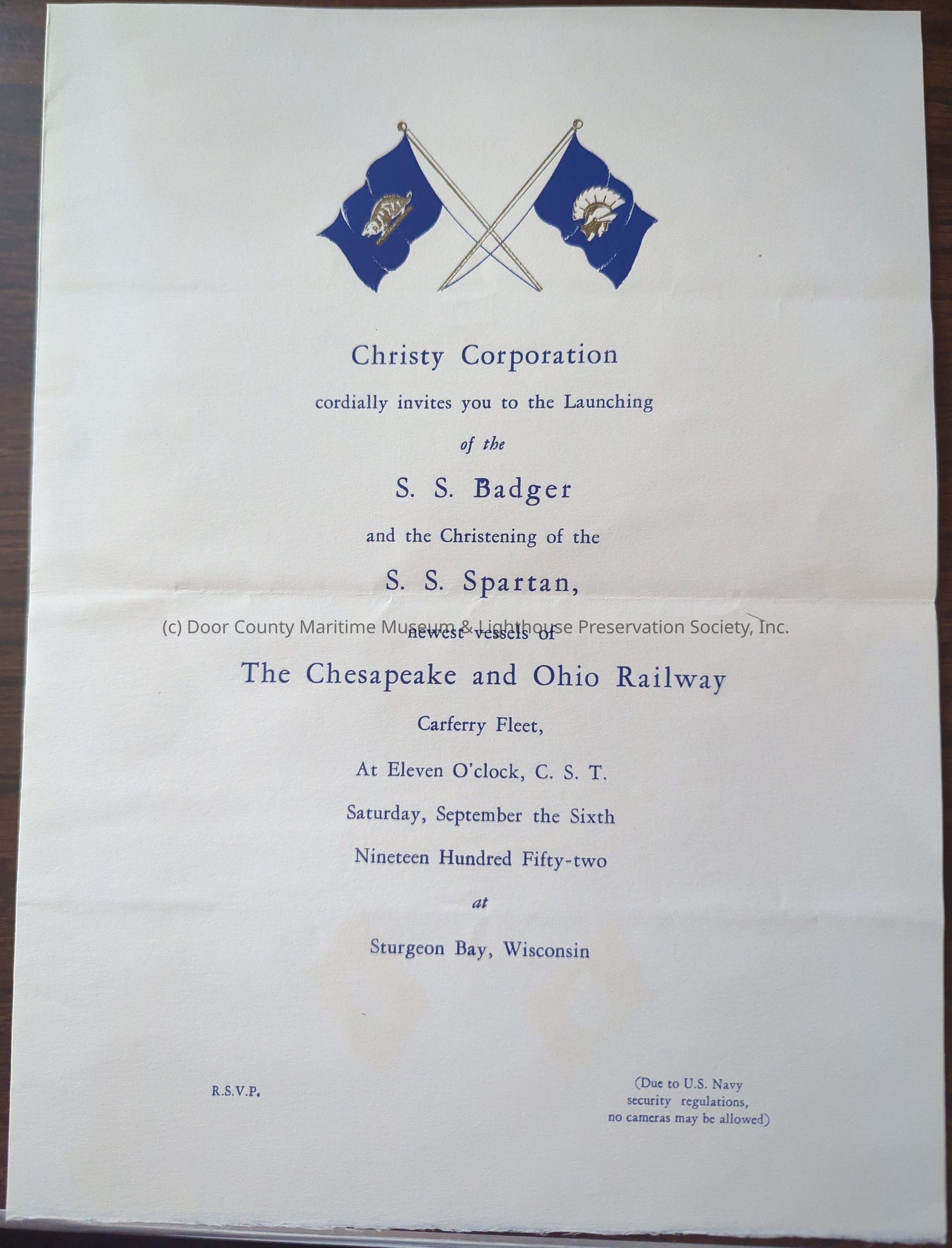 Cream colored paper with navy blue printing. "Christy Corporation cordially invites you to the launching of the S.S. Badger and the Christening of the S.S. Spartan.Location