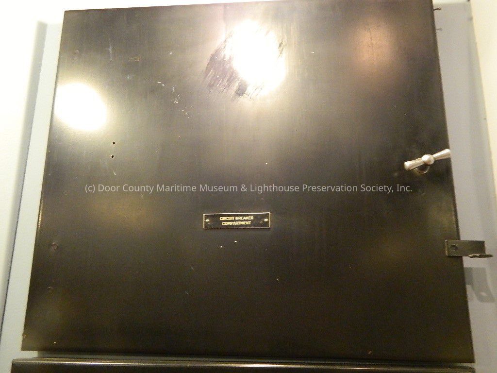 Painted black on front, grey on back; black latch on front; silver handle; black metal plate screwed (4 3/8"-1") ''CIRCUIT BREAKER COMPARTMENT"; latch lock on backside; two small holes drilled.Location