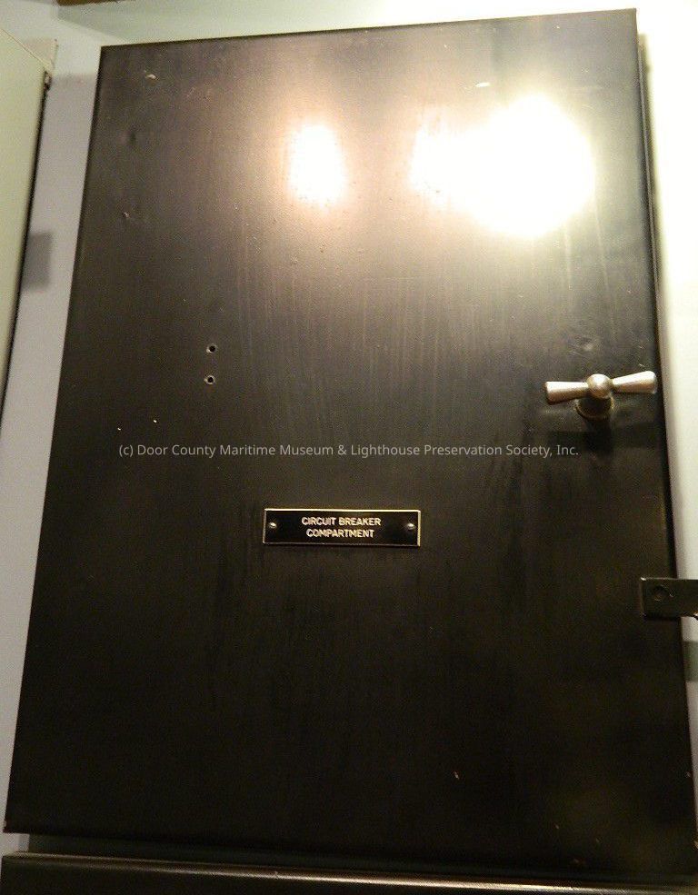 Painted black on front, grey on back; black latch on front; silver handle; black metal plate screwed on "CIRCUIT BREAKER COMPARTMENT" (4 3/8" x 1"); latch lock on backside; two small holes drilled.Location
