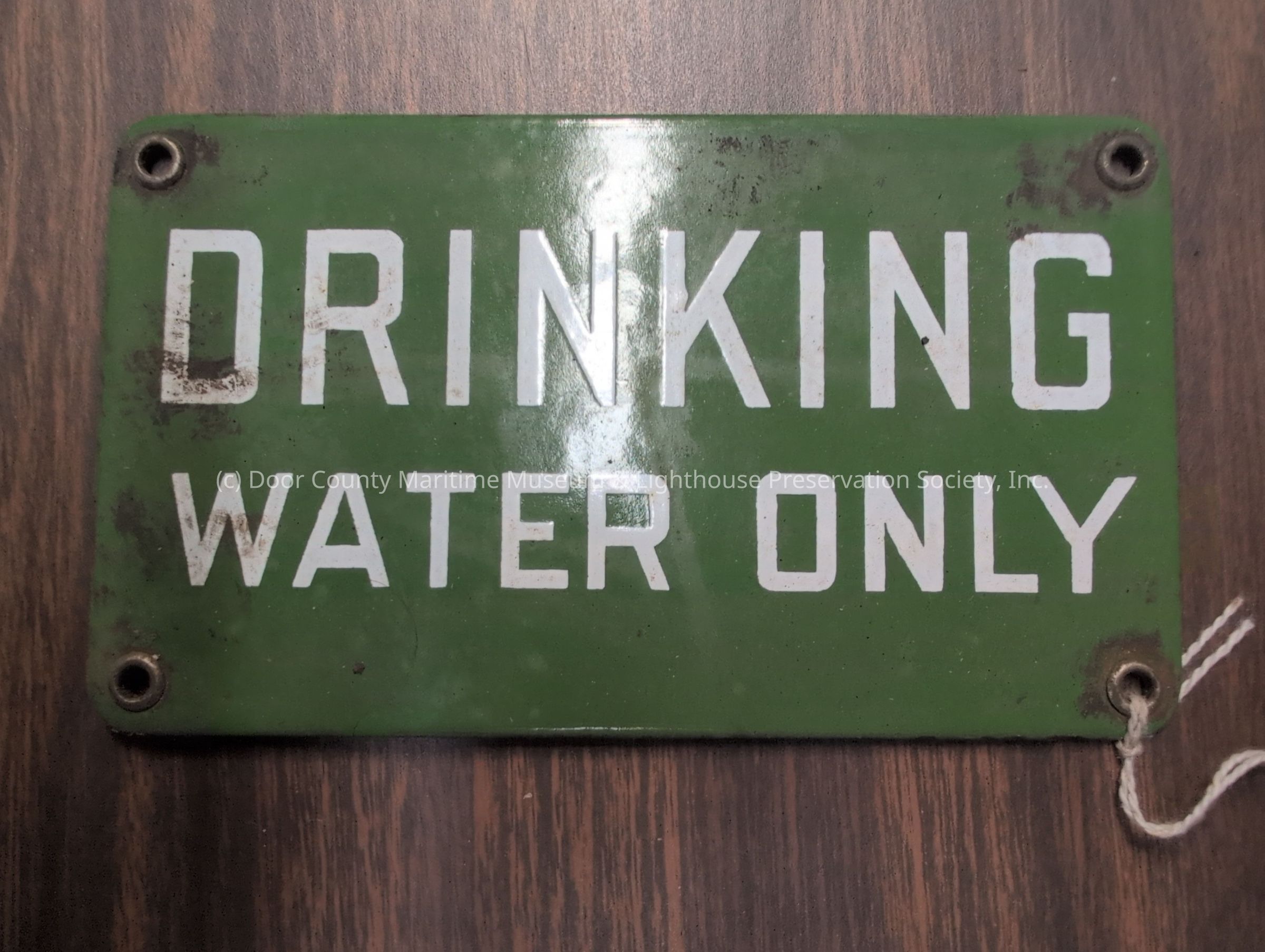 Nameplate from the vessel J.P. Morgan. Green sign with white lettering stating "Drinking water only"