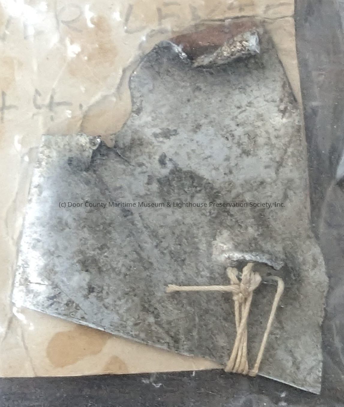 Metal remnant piece. Curved in corner. Twine wrapped through hole