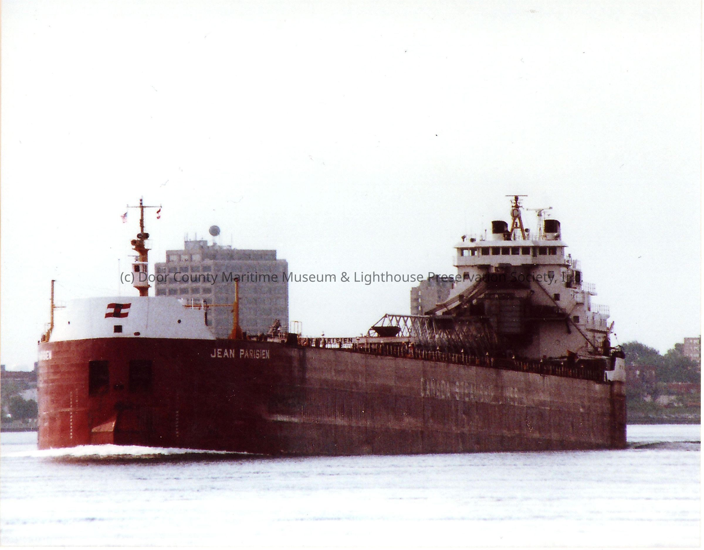 Self-unloader Jean Parisien underway in open water. Buildings in background. photo taken bow firstLocation
