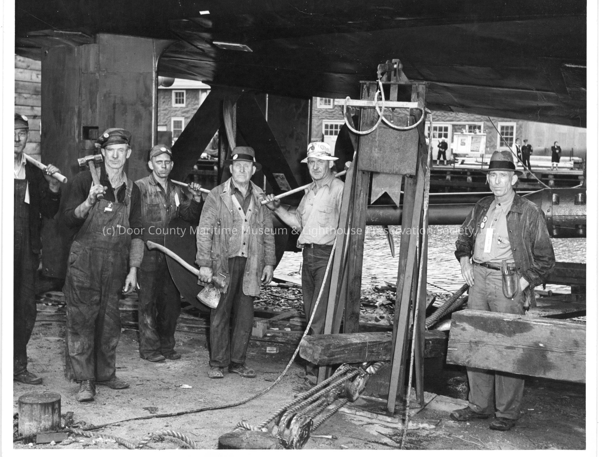 John Klaus and group of workers at shipyard with guards in backgroundEntry/Object ID