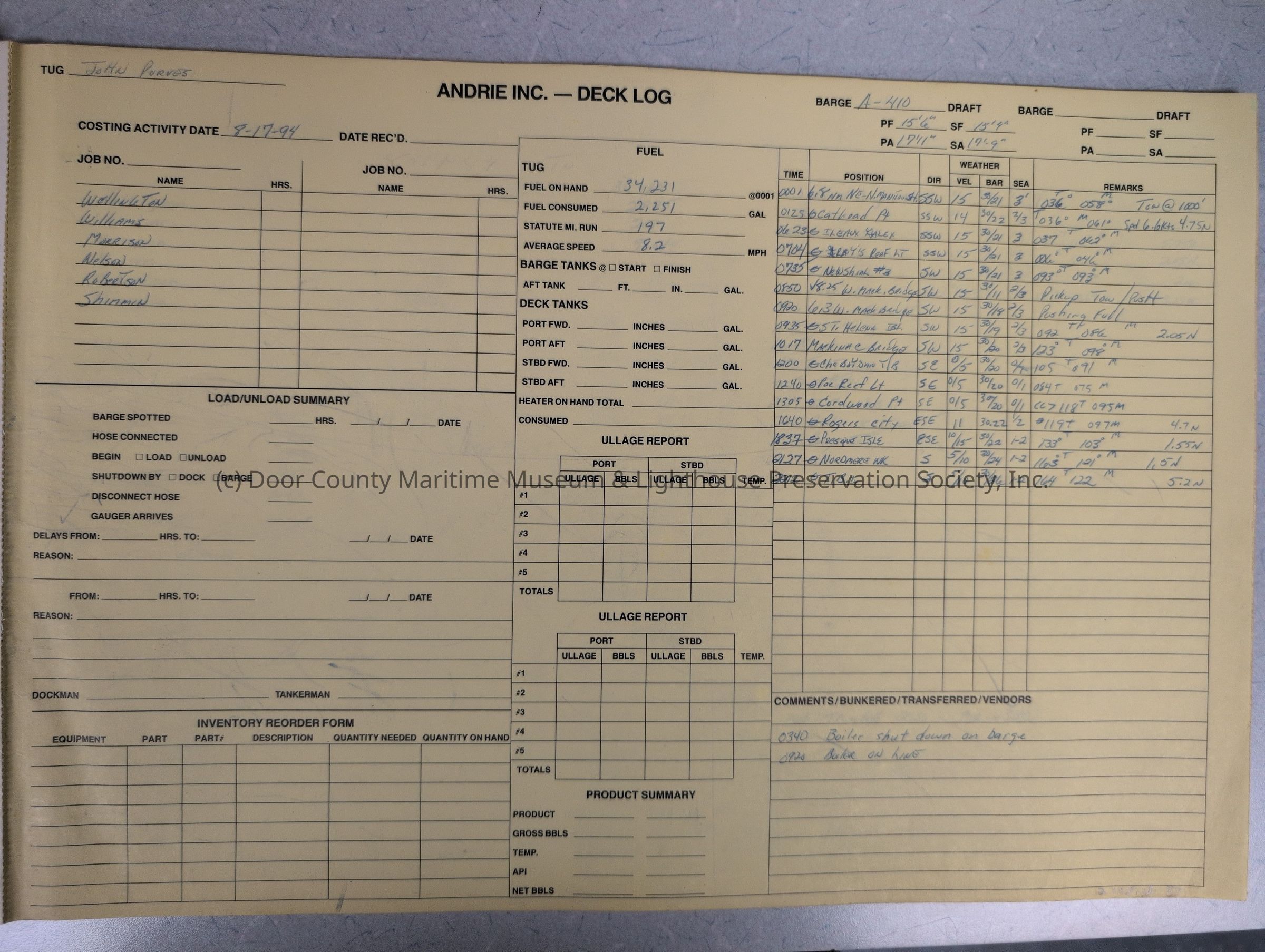 logs from tug "John Purves". Cream colored cover. Belongs to Andrie Inc. Dates from 8/17/1994-9/16/1994Location