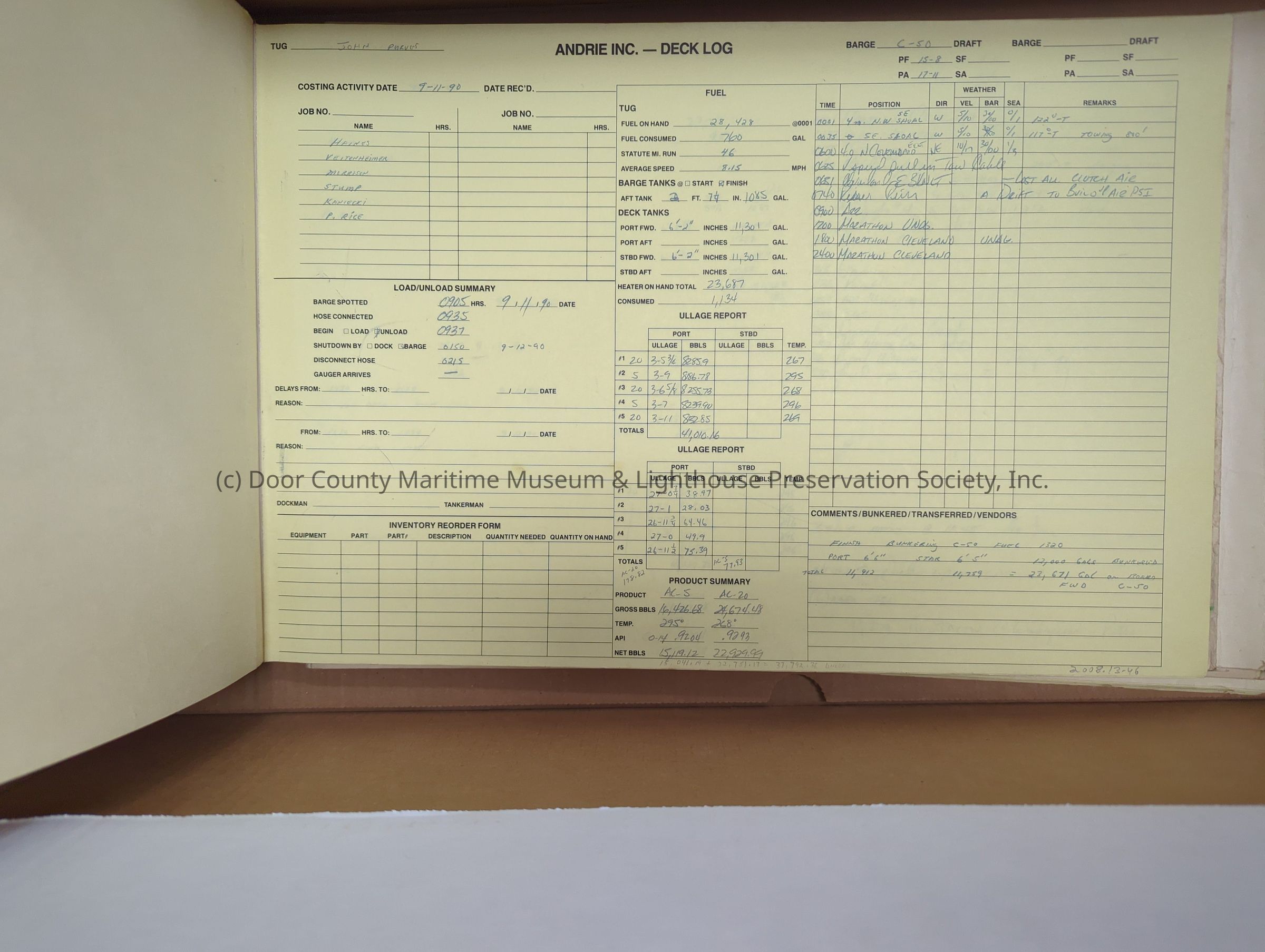 logs from tug "John Purves". Cream colored cover. Belongs to Andrie Inc. Dates from 9/11/1990-10/4/1990Location