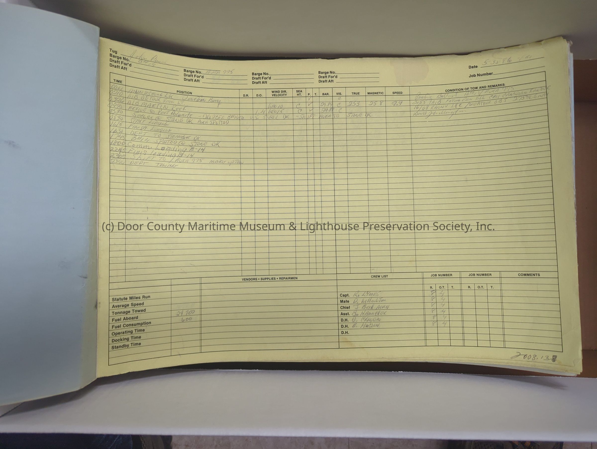 logs from tug "John Purves". Light blue cover with yellow pages. Belongs to Canonie. Dates from 5/30/1986-8/1/1986Location