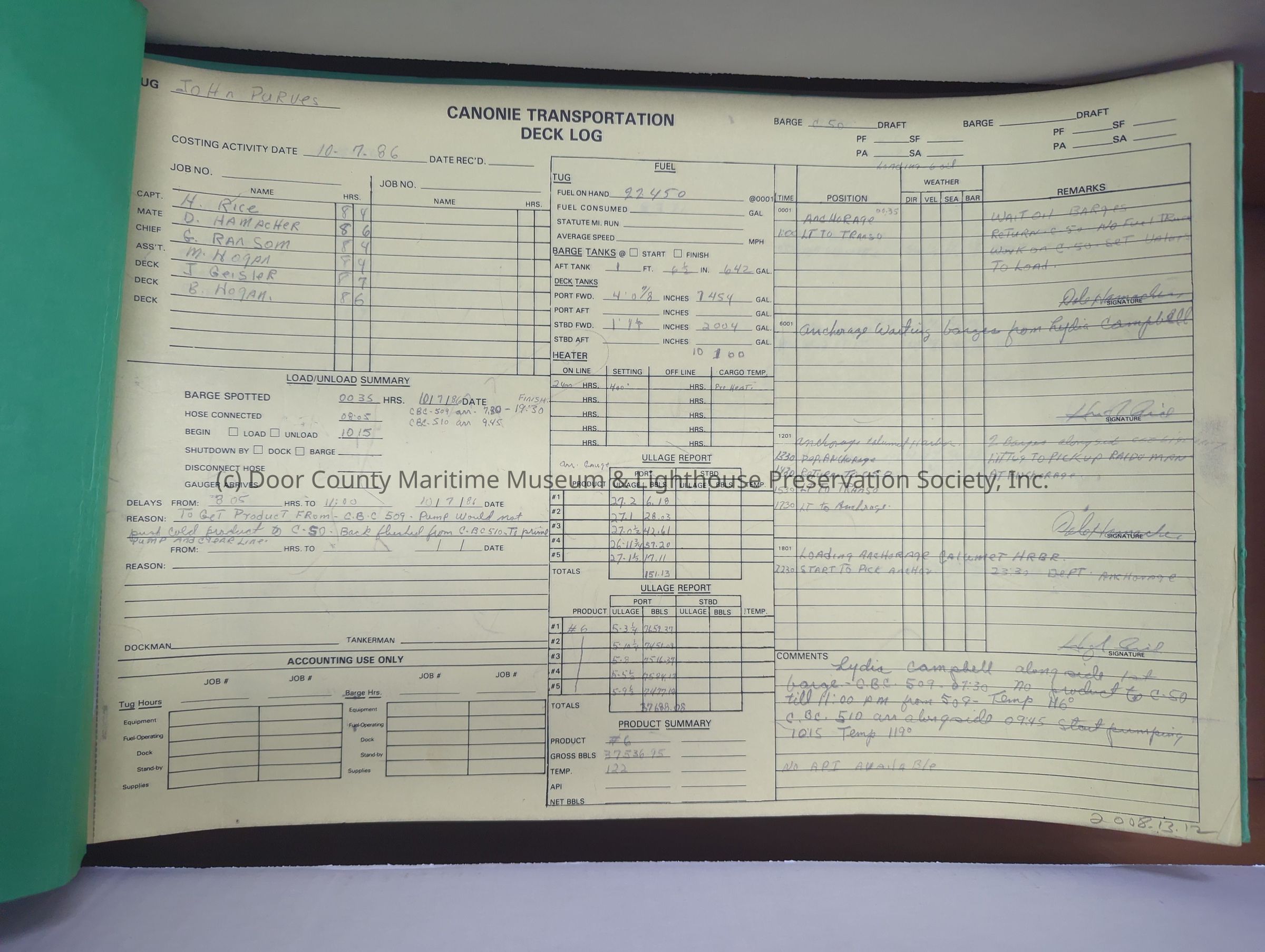 logs from tug "John Purves". Green cover with yellow pages. Belongs to Canonie. Dates from 10/1/1986-11/6/1986Location