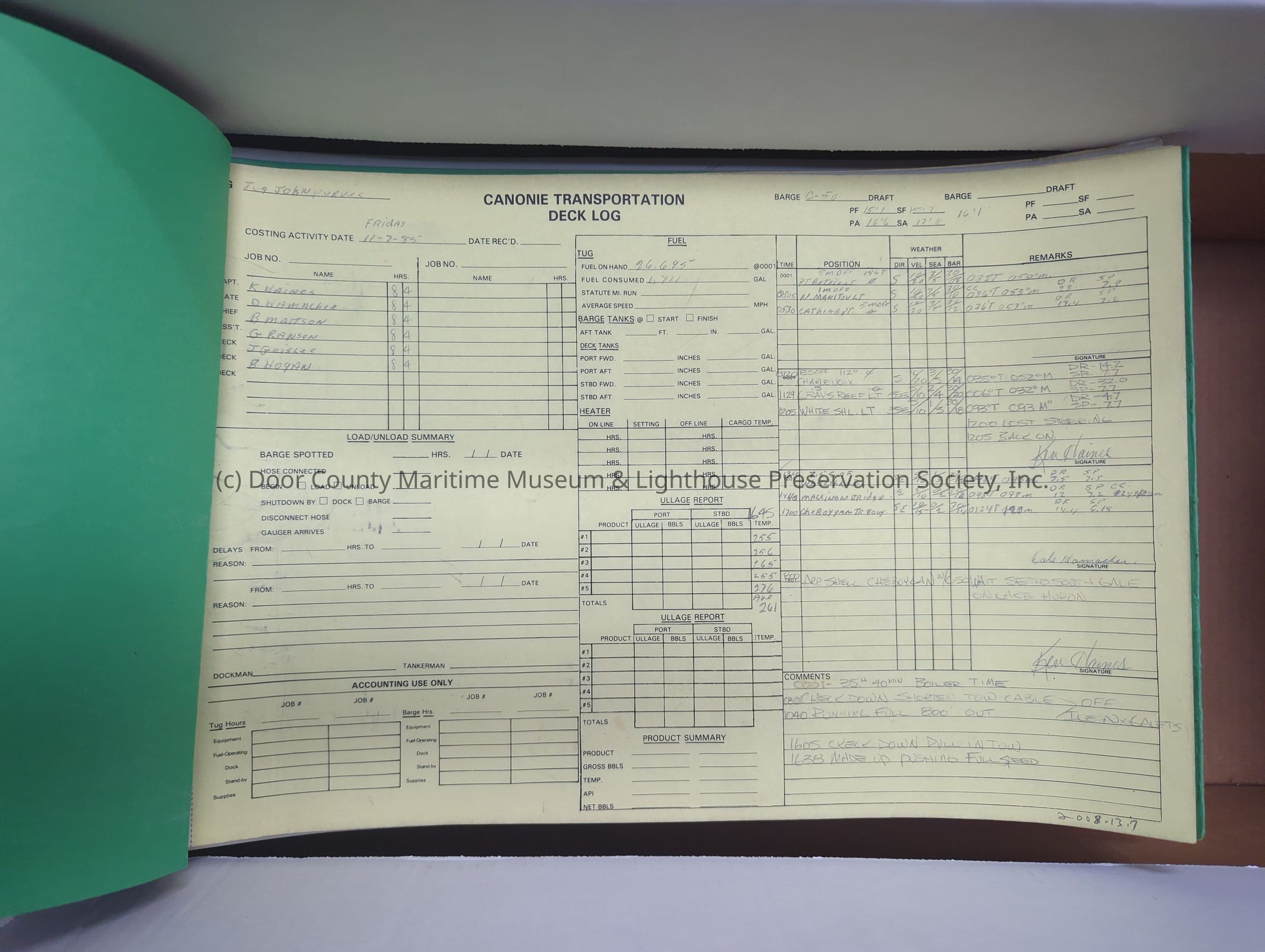 logs from tug "John Purves". Green cover with yellow pages. Belongs to Canonie. Dates from 11/7/1985-12/11/1986Location