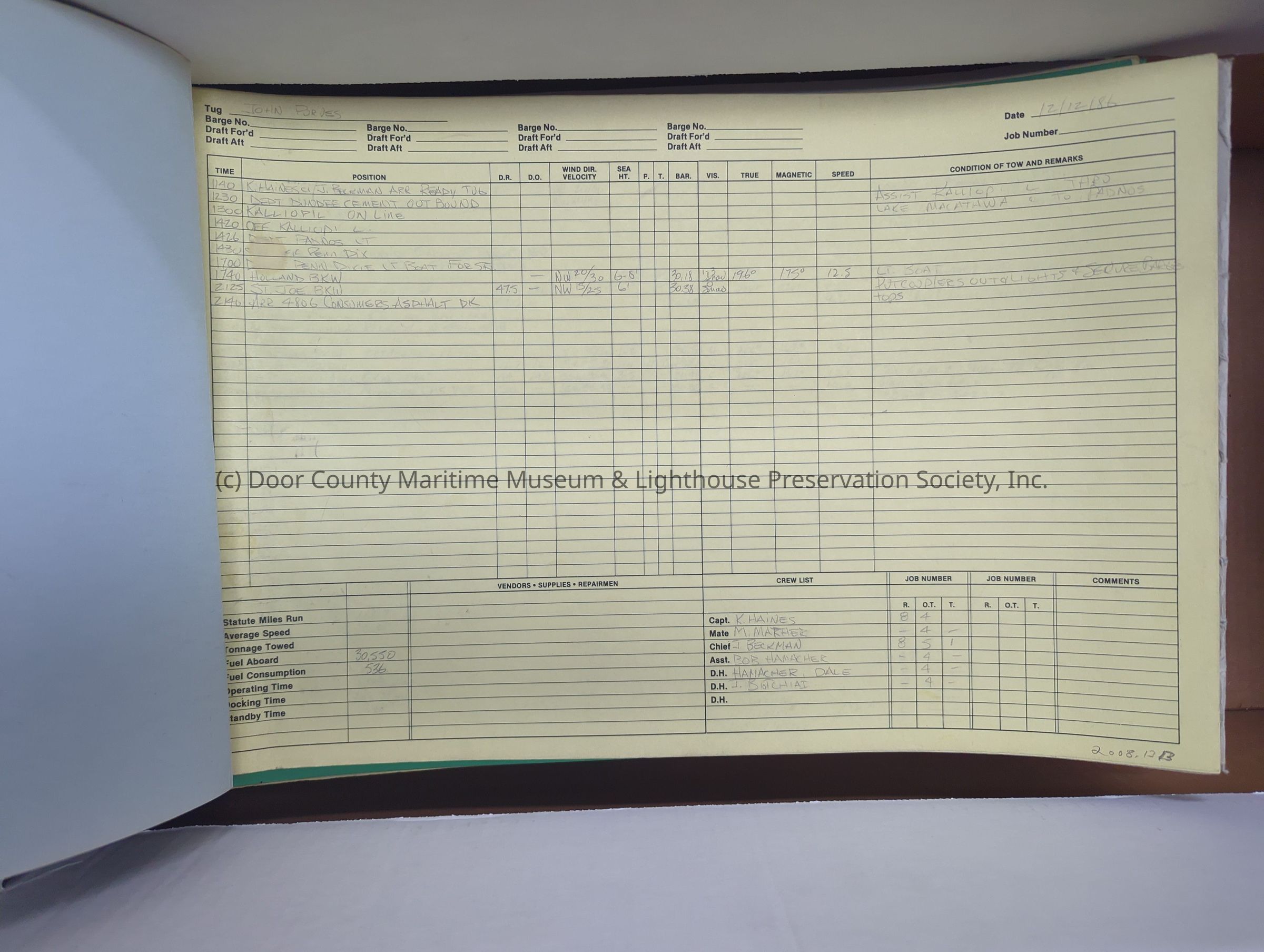 logs from tug "John Purves". Light blue cover with yellow pages. Belongs to Canonie. Dates from 12/12/1986-4/4/1987Location
