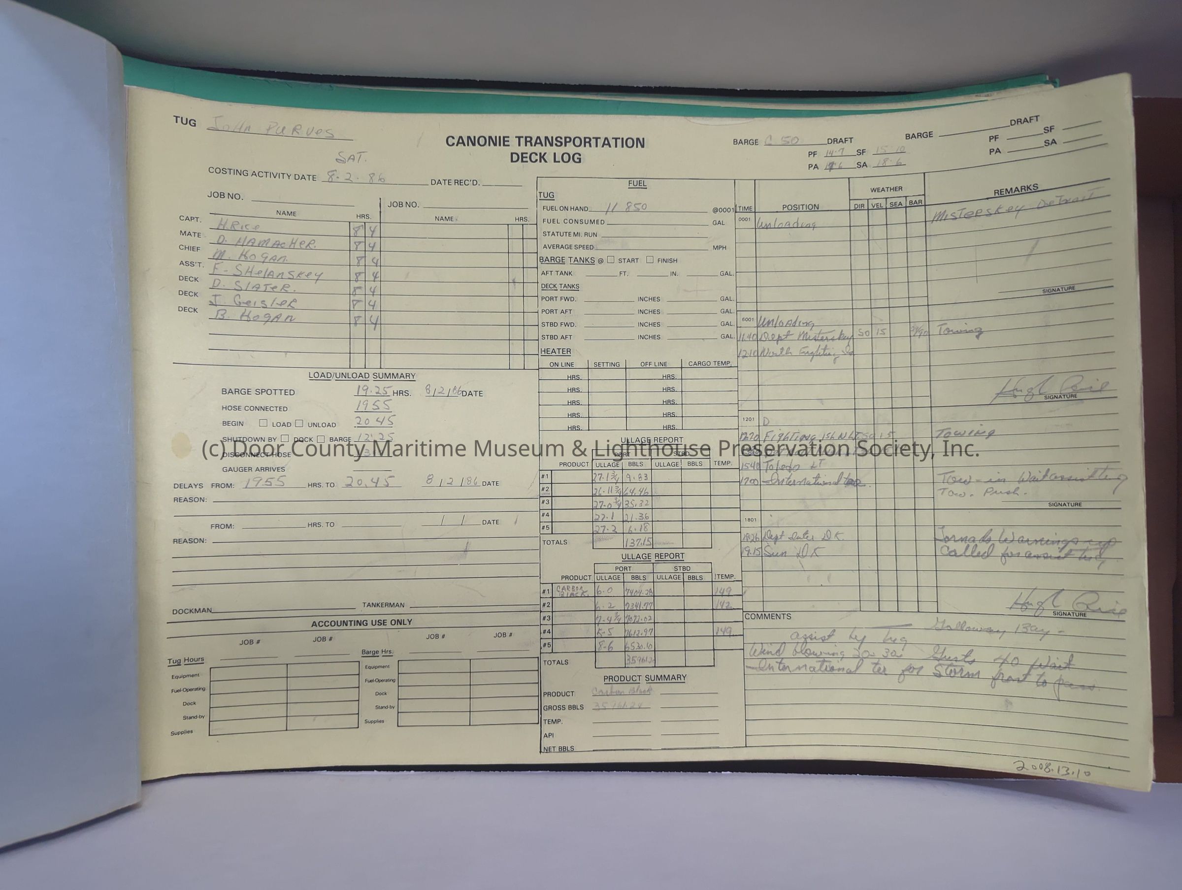 logs from tug "John Purves". Light blue cover with yellow pages. Belongs to Canonie. Dates from 8/2/1986-9/10/1986Location