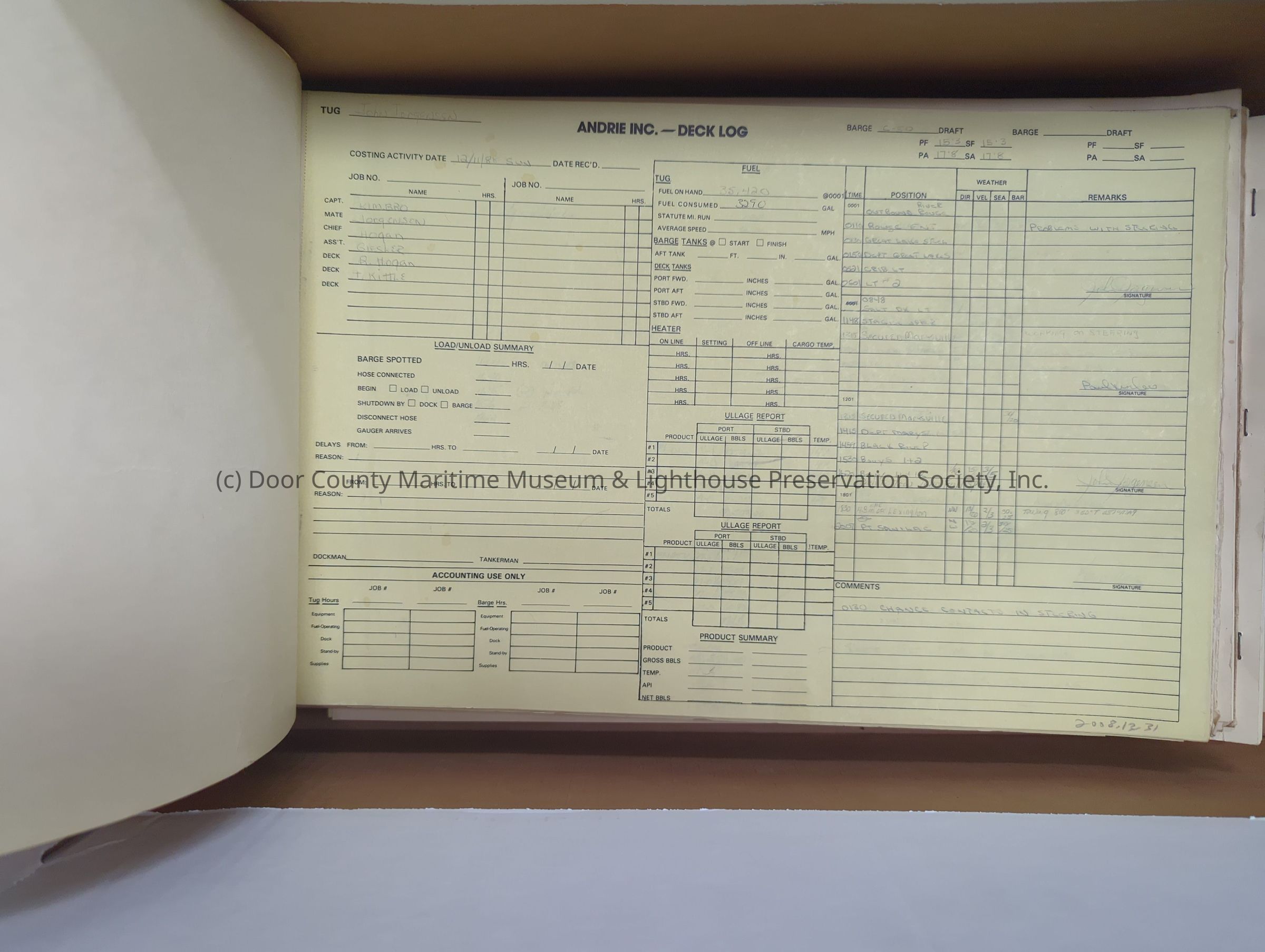 logs from tug "John Purves". Cream colored cover. Belongs to Andrie Inc. Dates from 12/11/1988-12/22/1988Location