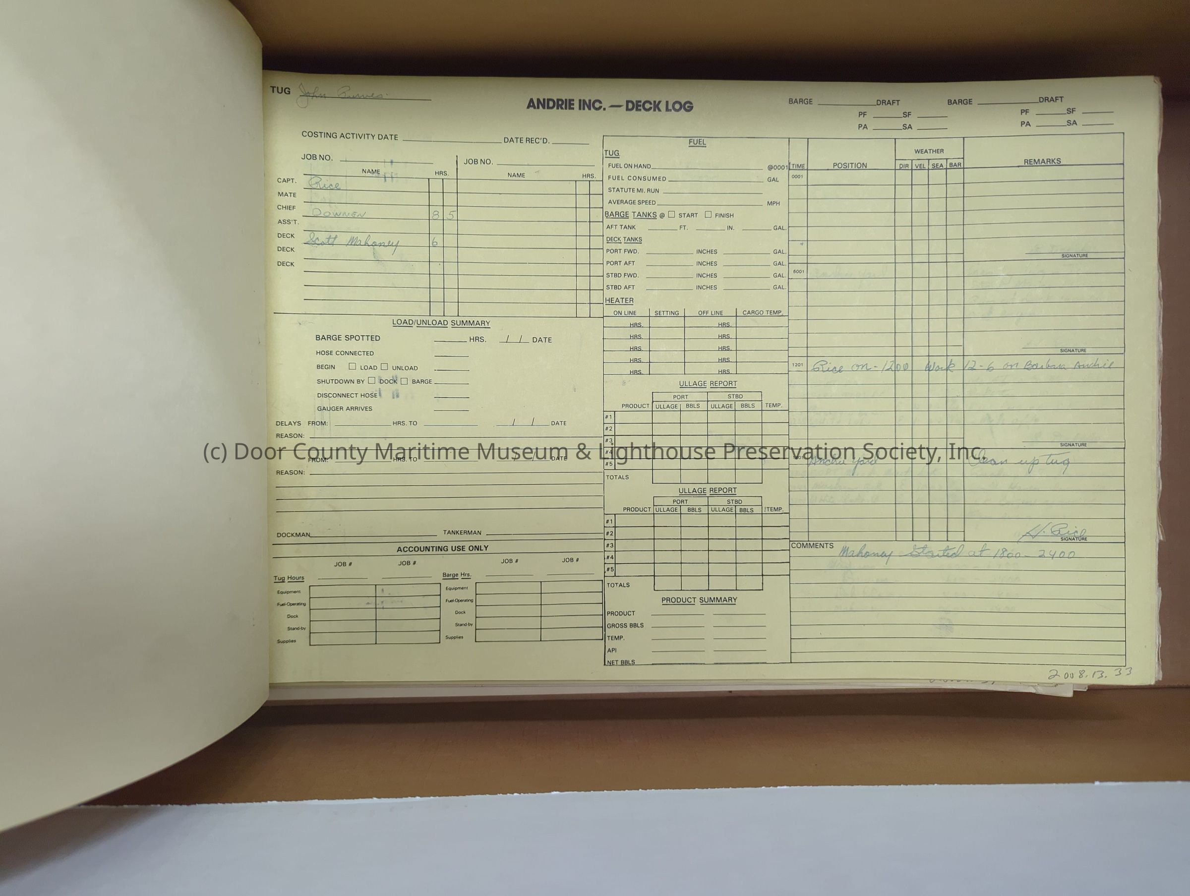 logs from tug "John Purves". Cream colored cover. Belongs to Andrie Inc. Dates from 6/12/1989-6/20/1989Location