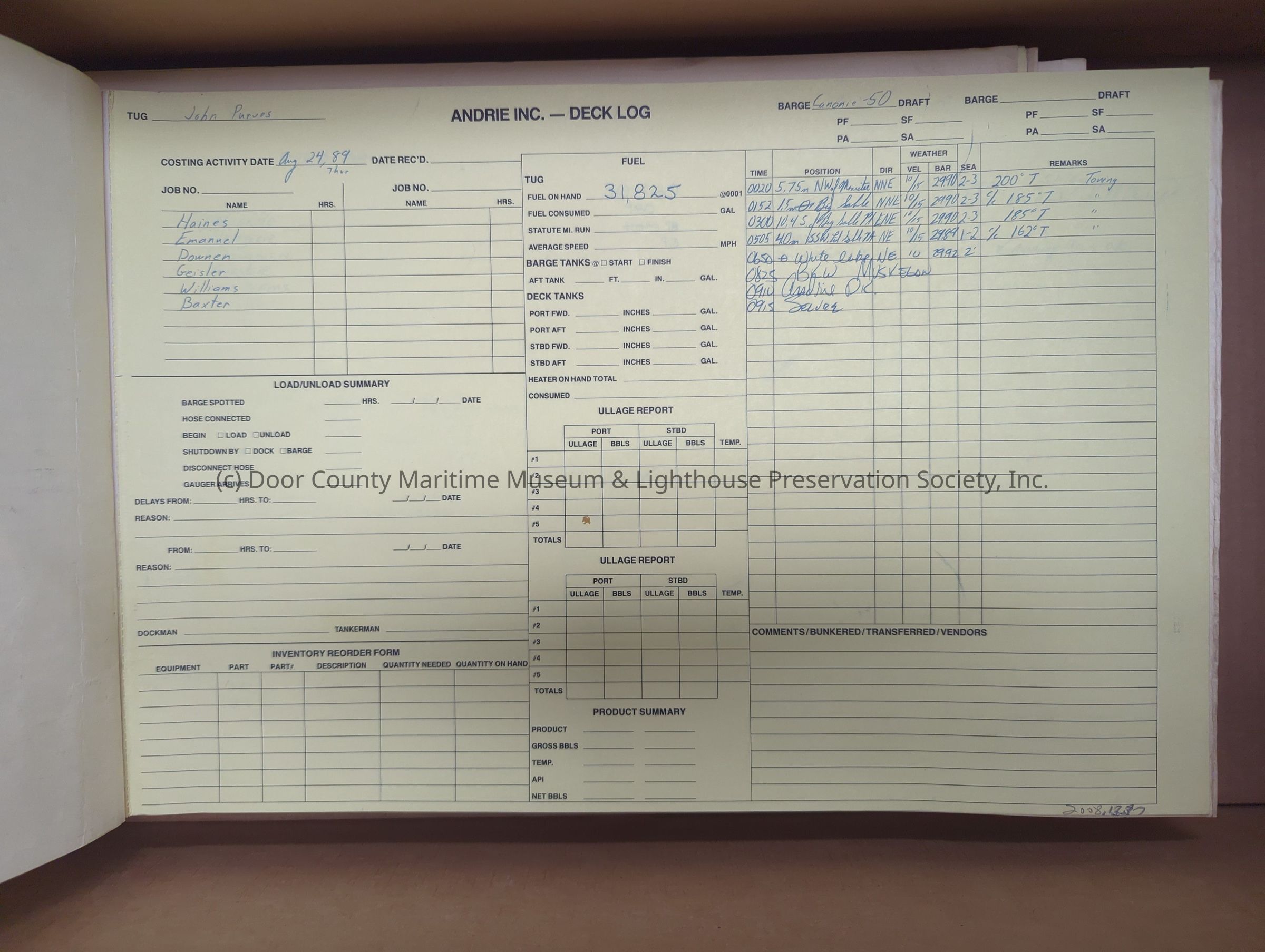 logs from tug "John Purves". Cream colored cover. Belongs to Andrie Inc. Dates from 8/24/1989-9/19/1989Location