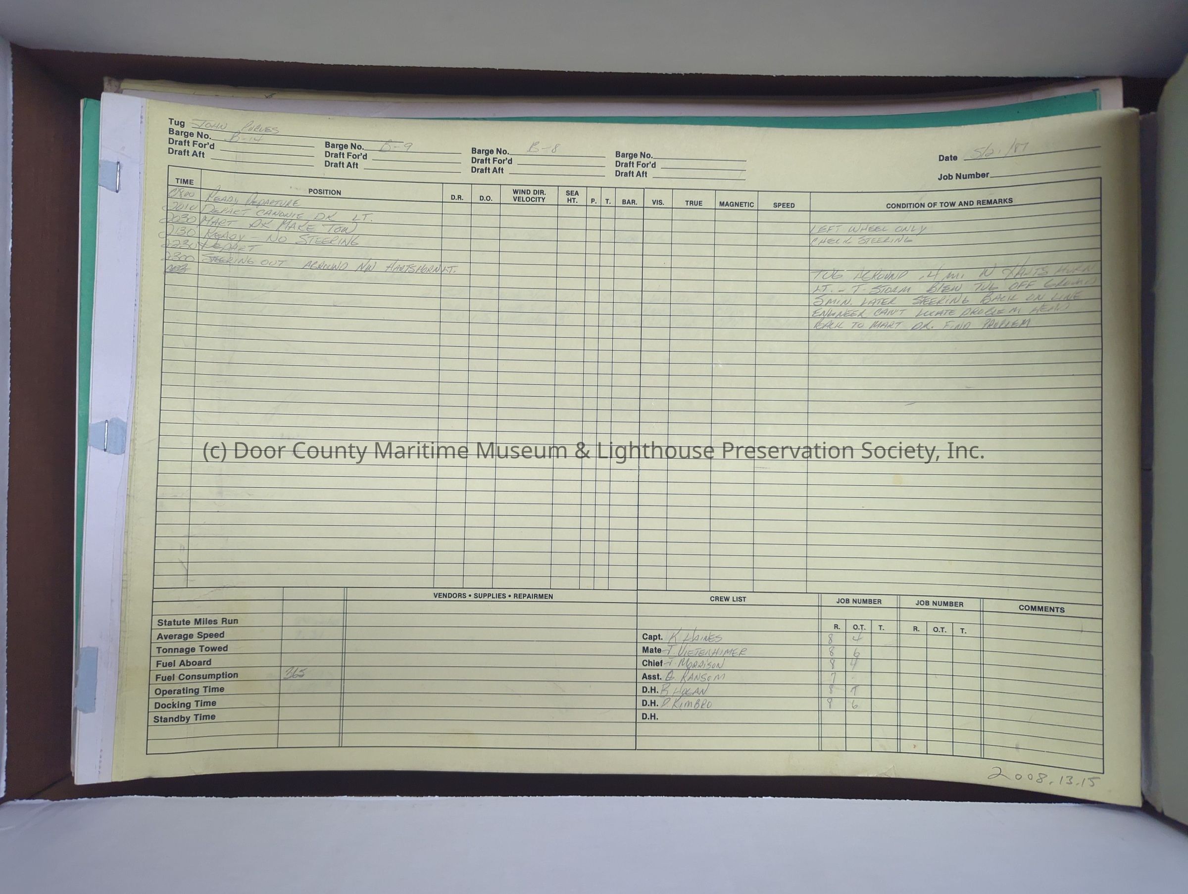 logs from tug "John Purves". Light blue cover with yellow pages. Belongs to Canonie. Dates from 5/21/1987-5/29/1987 and 4/10/1988-4/30/1988Location