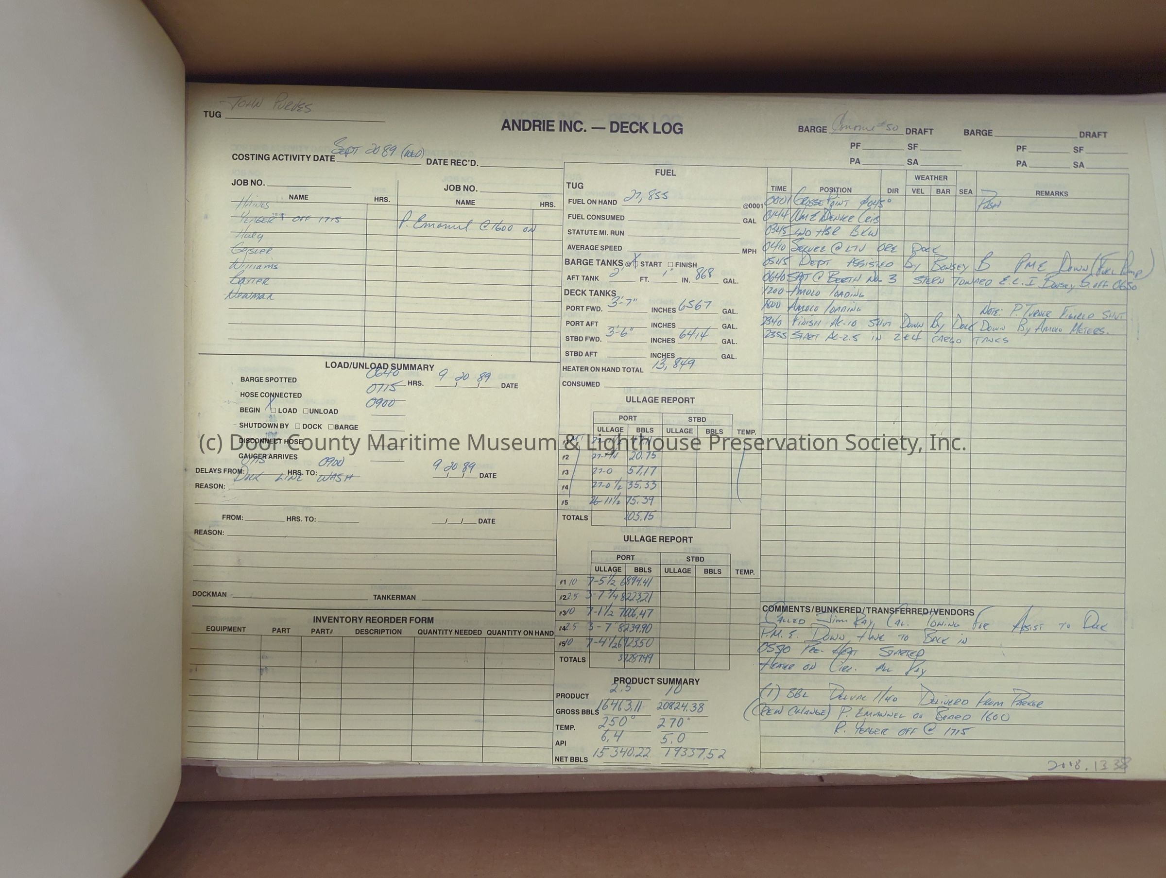 logs from tug "John Purves". Cream colored cover. Belongs to Andrie Inc. Dates from 9/20/1989-10/12/1989Location