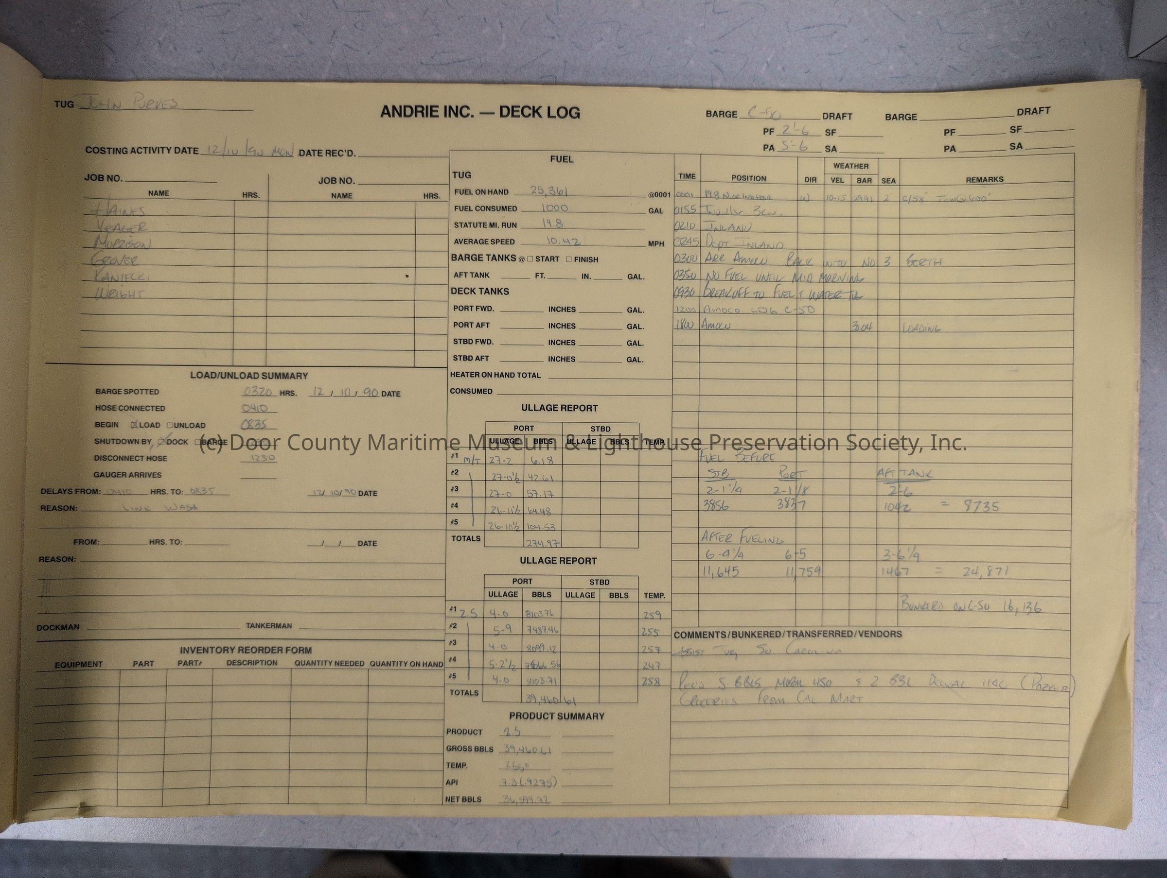 logs from tug "John Purves". Cream colored cover. Belongs to Andrie Inc. Dates from 12/10/1990-1/3/1991Location