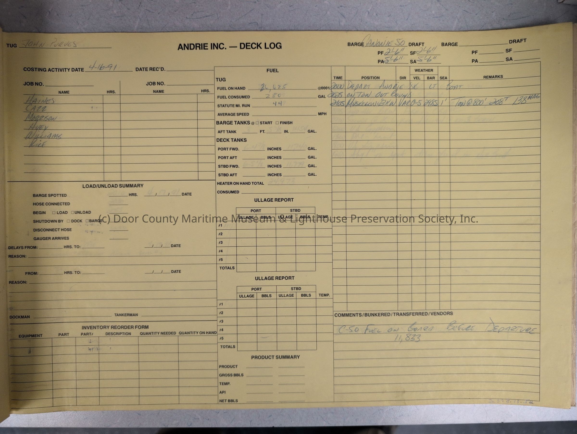 logs from tug "John Purves". Cream colored cover. Belongs to Andrie Inc. Dates from 4/16/1991-5/8/1991Location