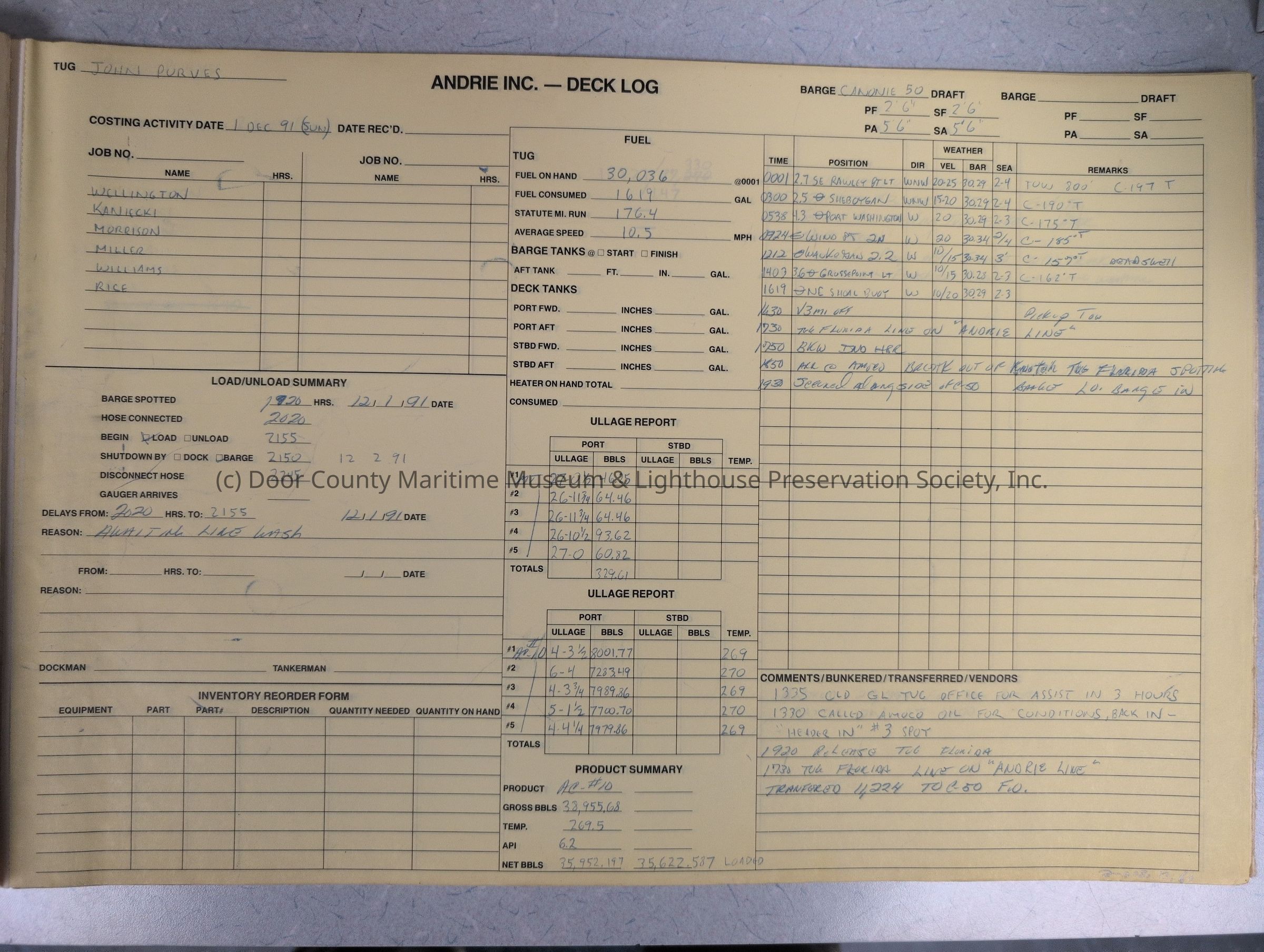 logs from tug "John Purves". Cream colored cover. Belongs to Andrie Inc. Dates from 12/1/1991-4/18/1992Location