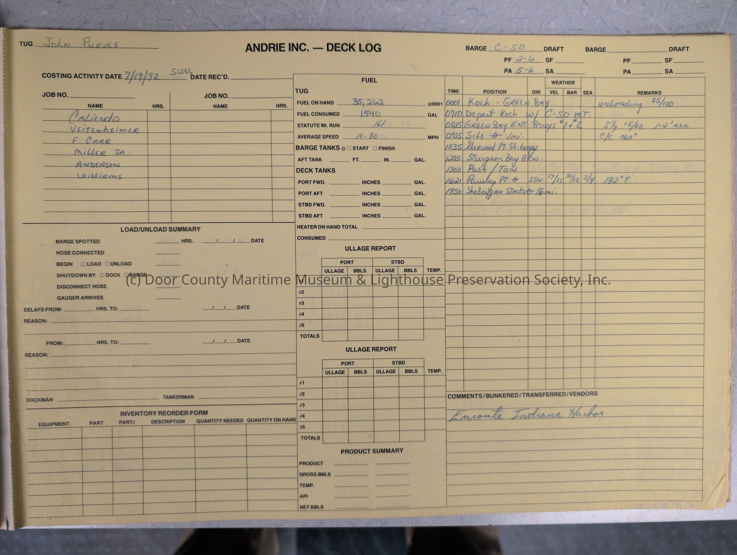 logs from tug "John Purves". Cream colored cover. Belongs to Andrie Inc. Dates from 7/19/1992-8/17/1992Location