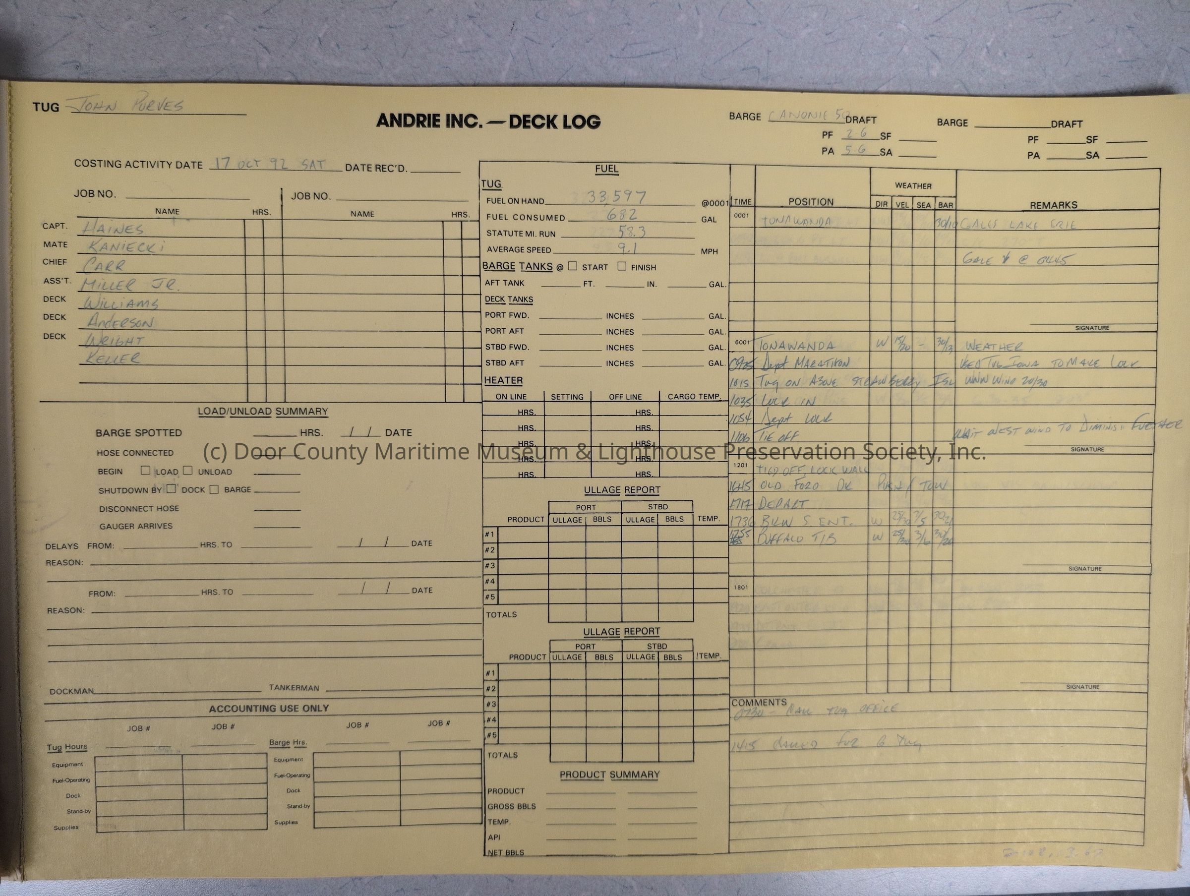 logs from tug "John Purves". Cream colored cover. Belongs to Andrie Inc. Dates from 10/17/1992-10/22/1992Location