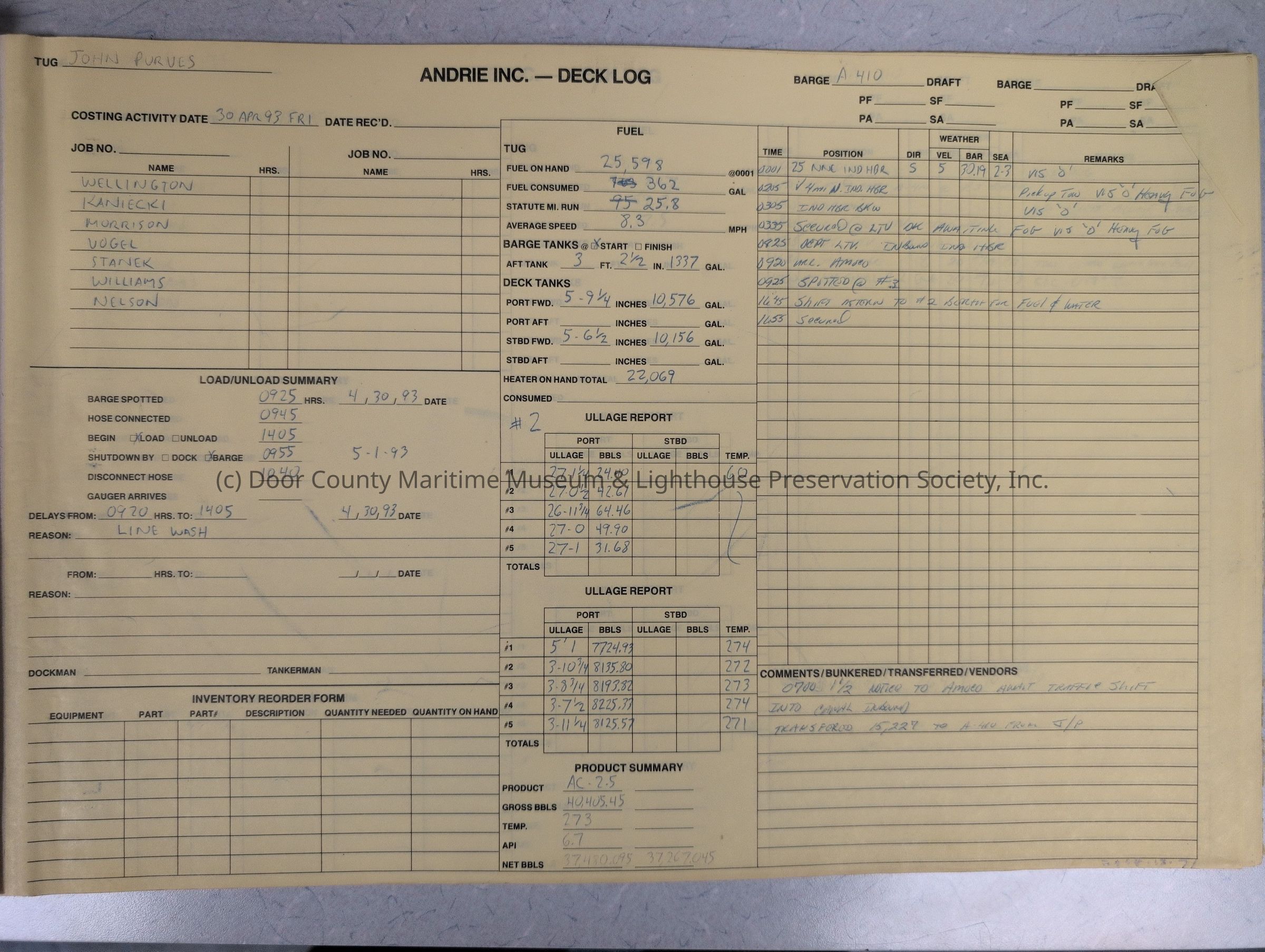 logs from tug "John Purves". Cream colored cover. Belongs to Andrie Inc. Dates from 4/30/1993-5/30/1993Location