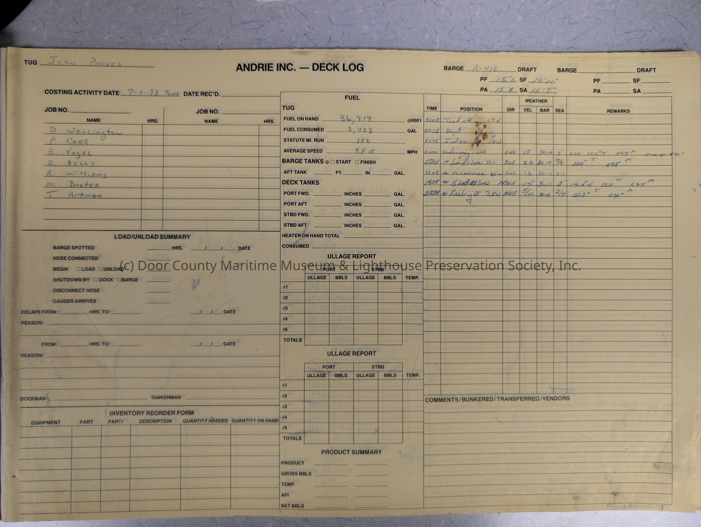 logs from tug "John Purves". Cream colored cover. Belongs to Andrie Inc. Dates from 7/1/1993-7/30/1993Location