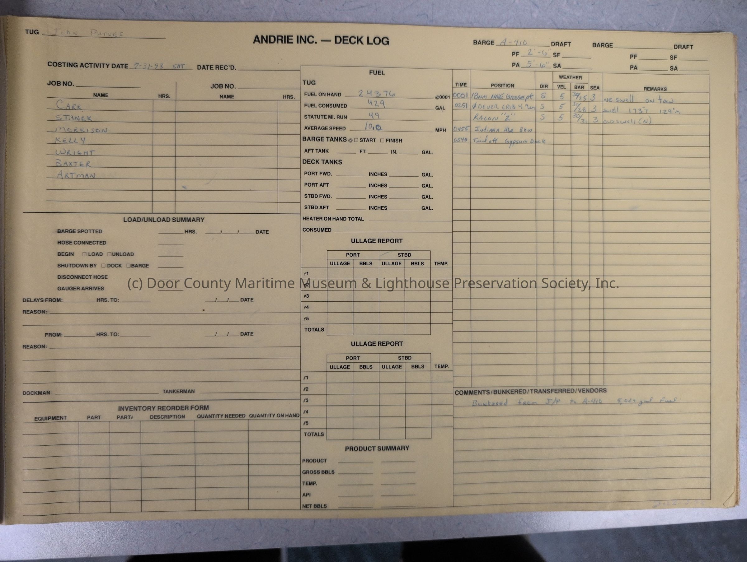 logs from tug "John Purves". Cream colored cover. Belongs to Andrie Inc. Dates from 7/31/1993-8/29/1993Location