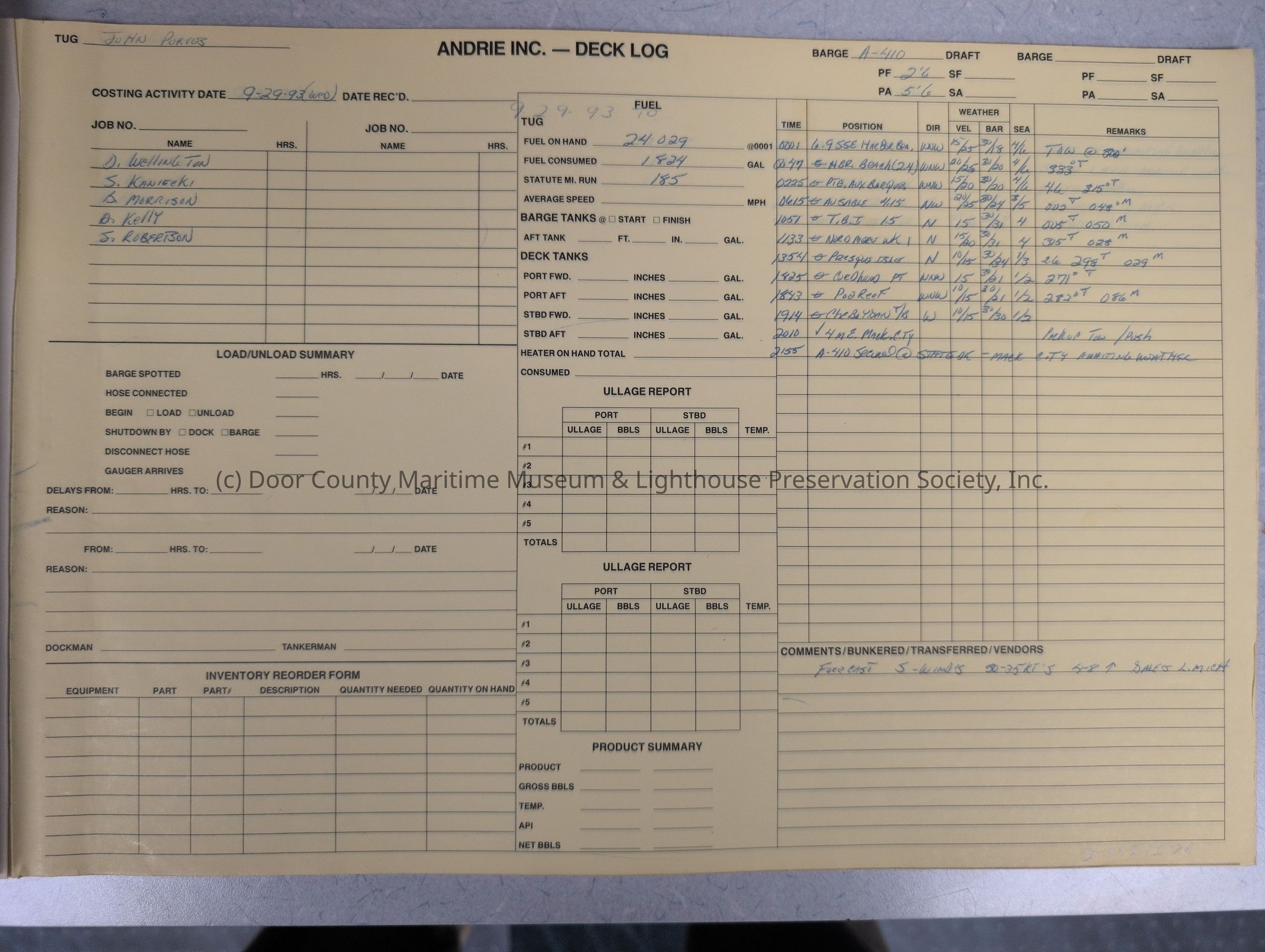 logs from tug "John Purves". Cream colored cover. Belongs to Andrie Inc. Dates from 9/29/1993-10/26/1993Location