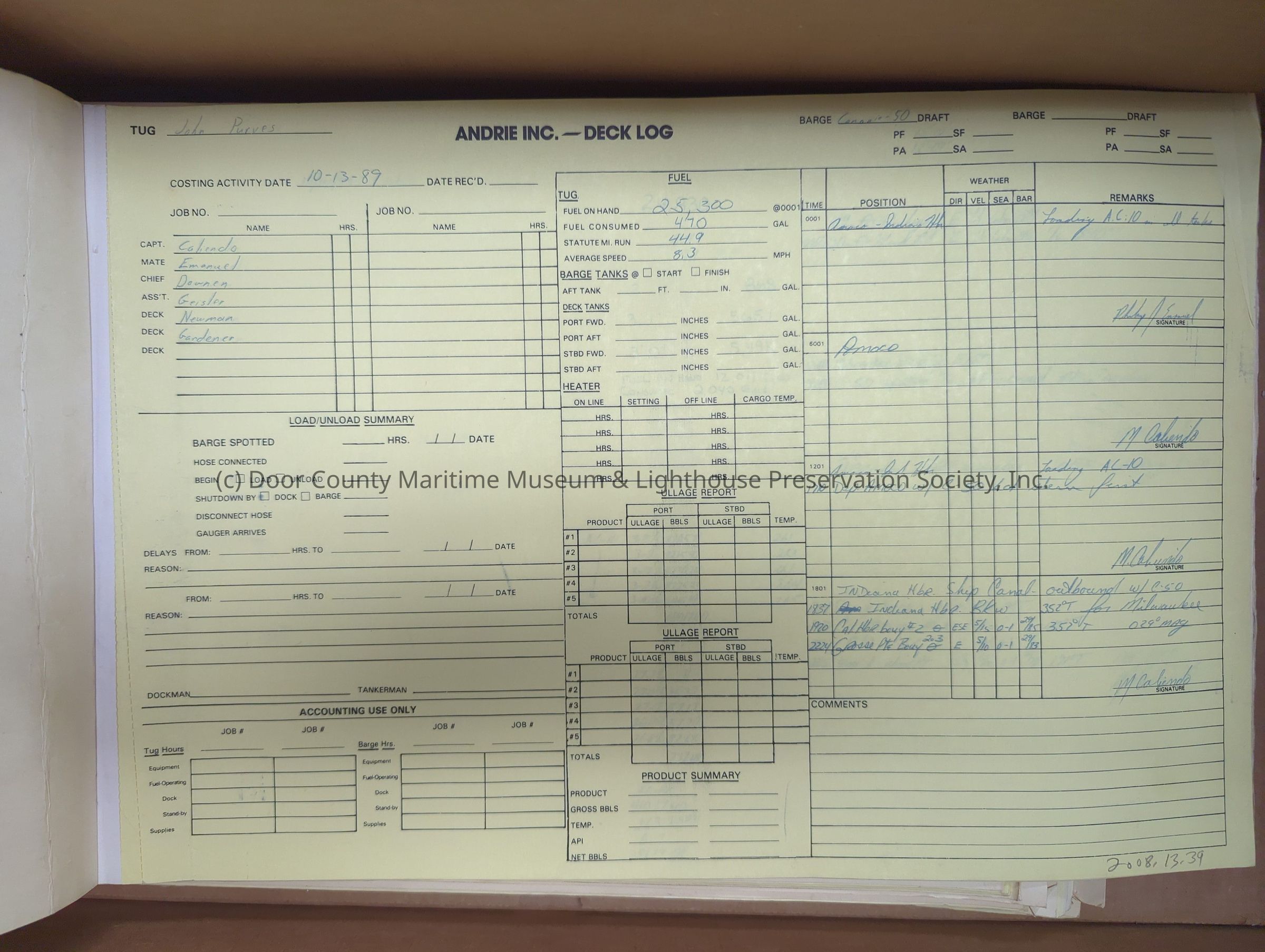 logs from tug "John Purves". Cream colored cover. Belongs to Andrie Inc. Dates from 10/13/1989-11/6/1989Location