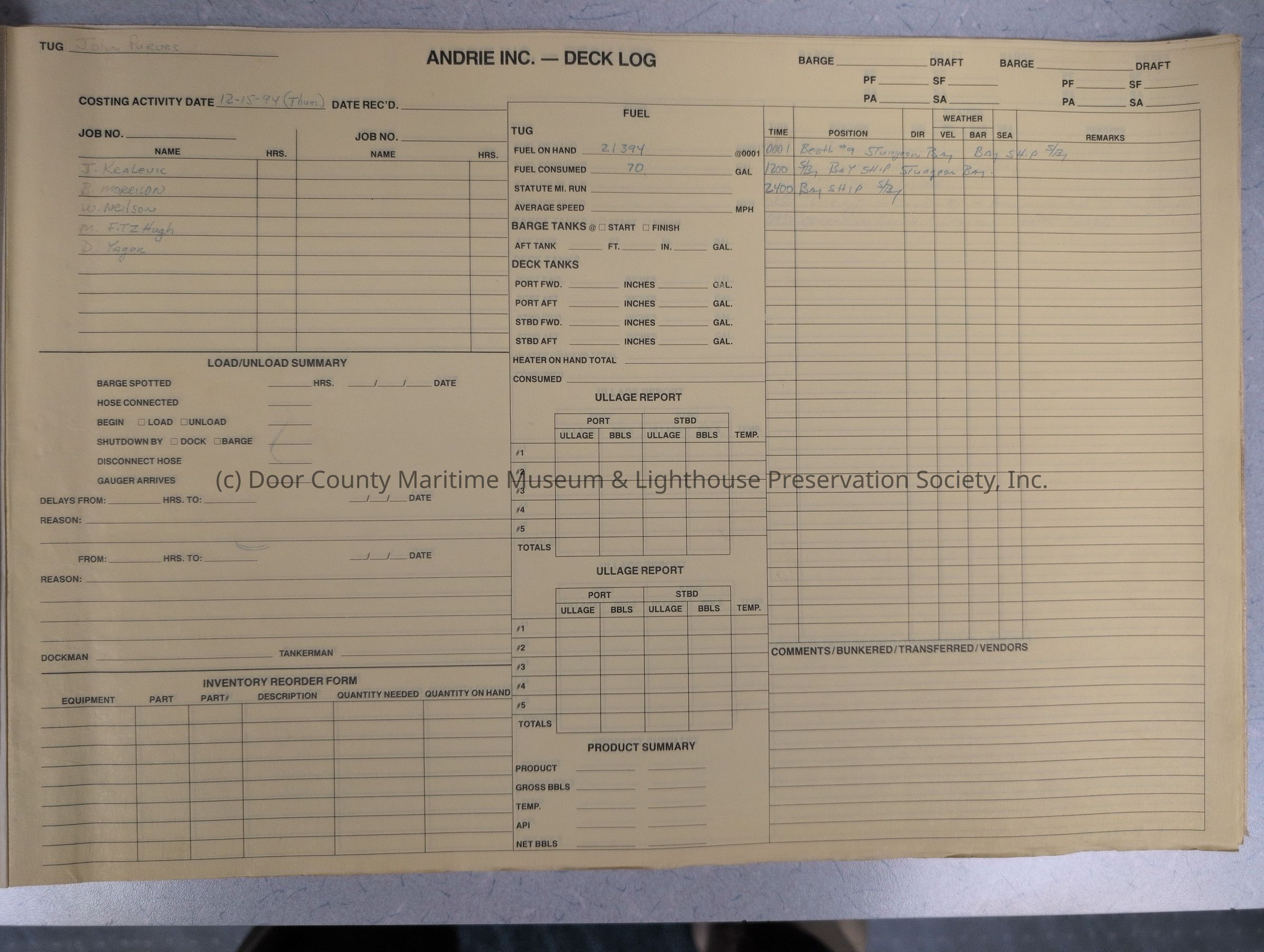 logs from tug "John Purves". Cream colored cover. Belongs to Andrie Inc. Dates from 12/15/1994-6/7/1995Location