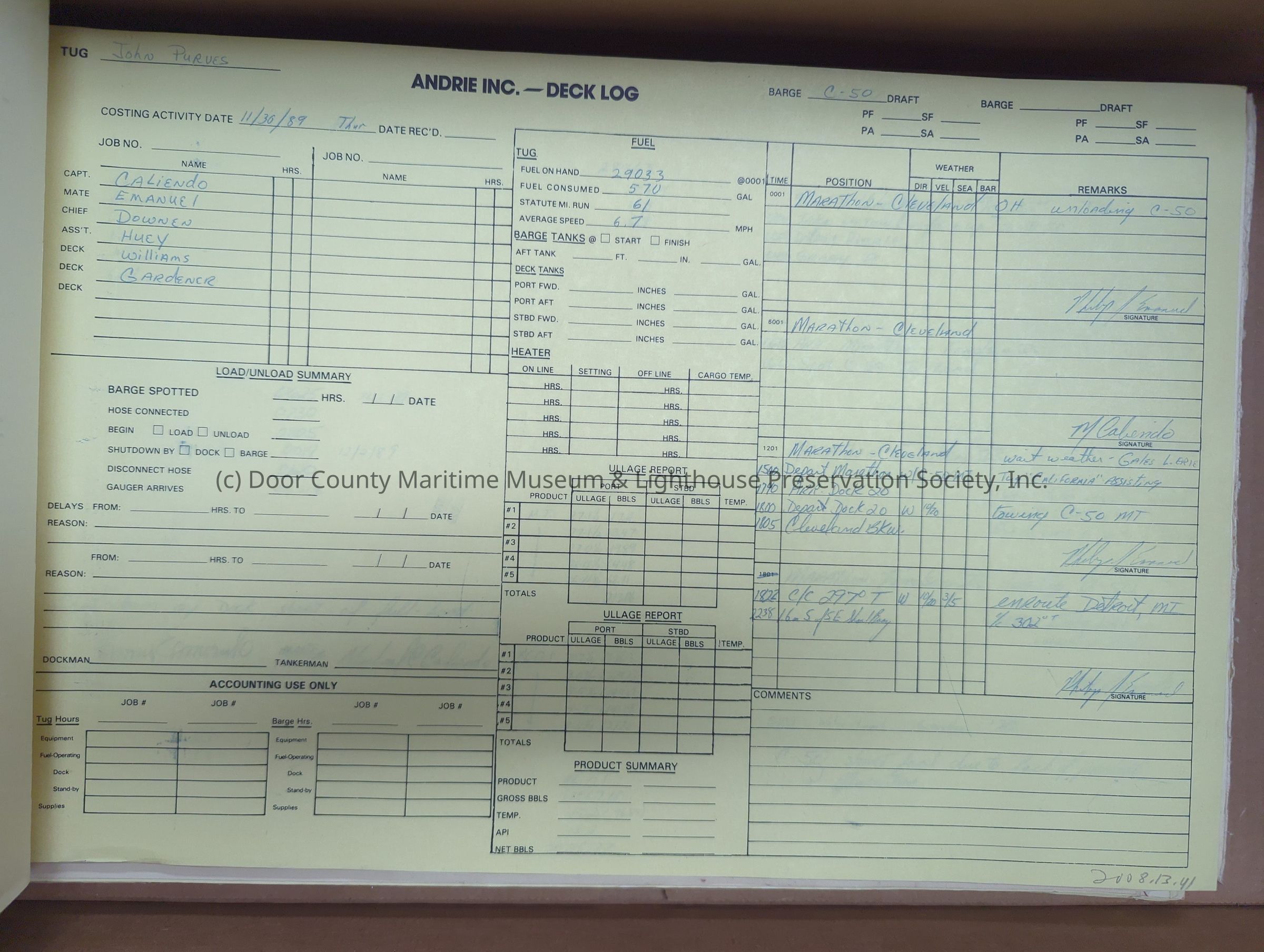 logs from tug "John Purves". Cream colored cover. Belongs to Andrie Inc. Dates from 11/30/1989-12/21/1989Location
