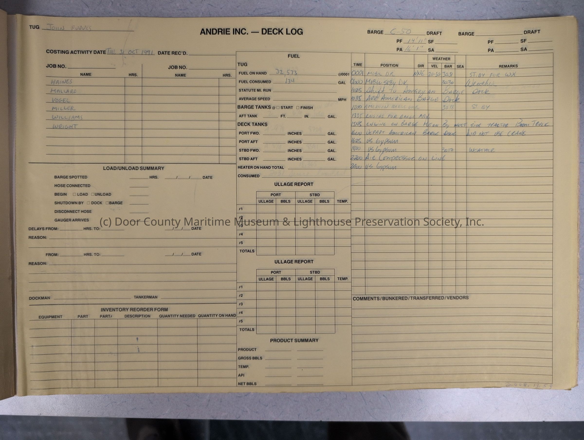logs from tug "John Purves". Cream colored cover. Belongs to Andrie Inc. Dates from 10/31/1991-11/30/1991Location