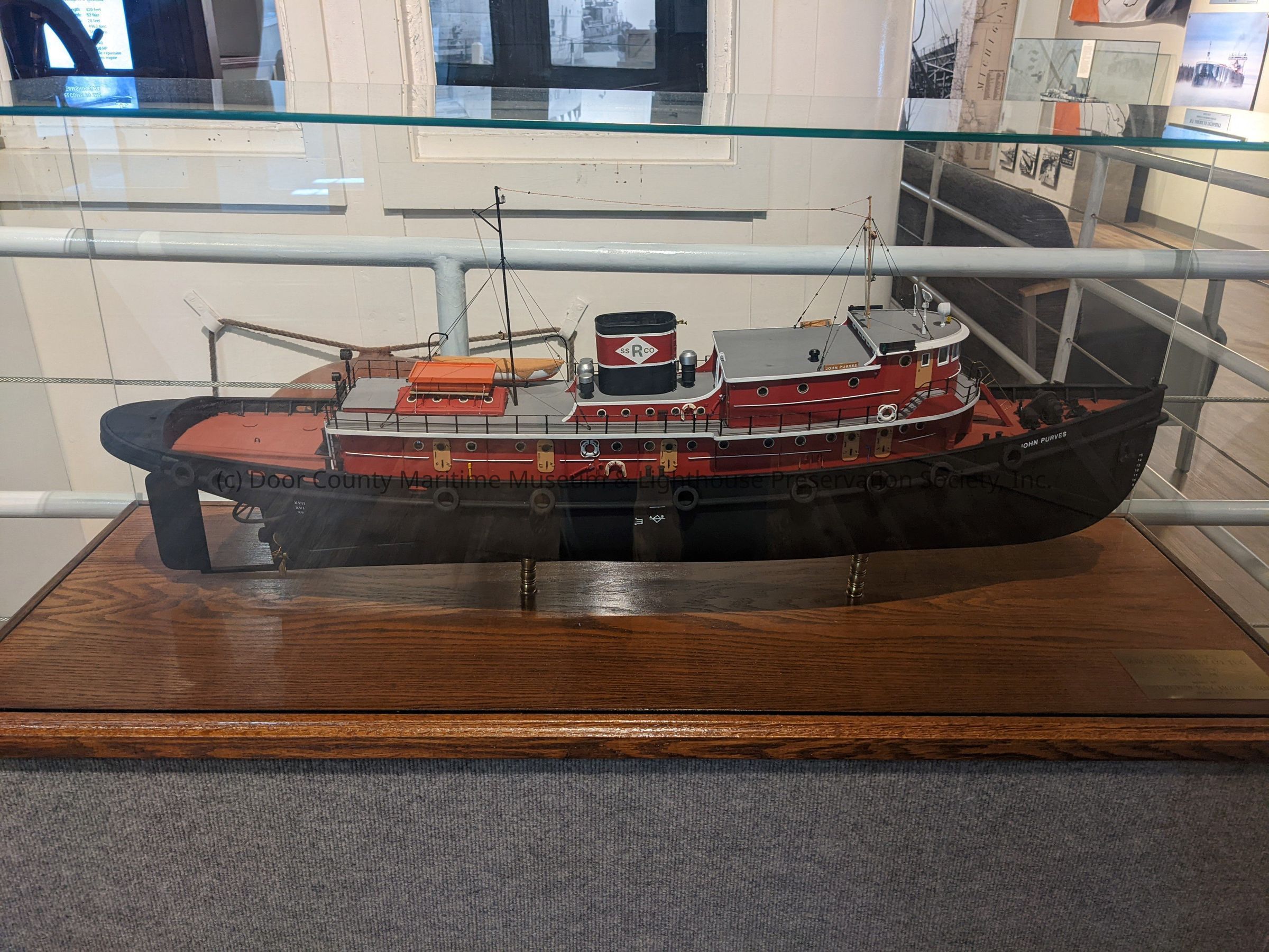 Ship model of "John Purves"; scale 1/4" = 1'; black lower hull; red deck & "cabins"; gray top deck; smokestack with S R Co logo; life boat & life raft; black tire bumpers on each side; "John Purves" (white) on each side of bow; "John Purves" (white) on front of pilothouse;Location