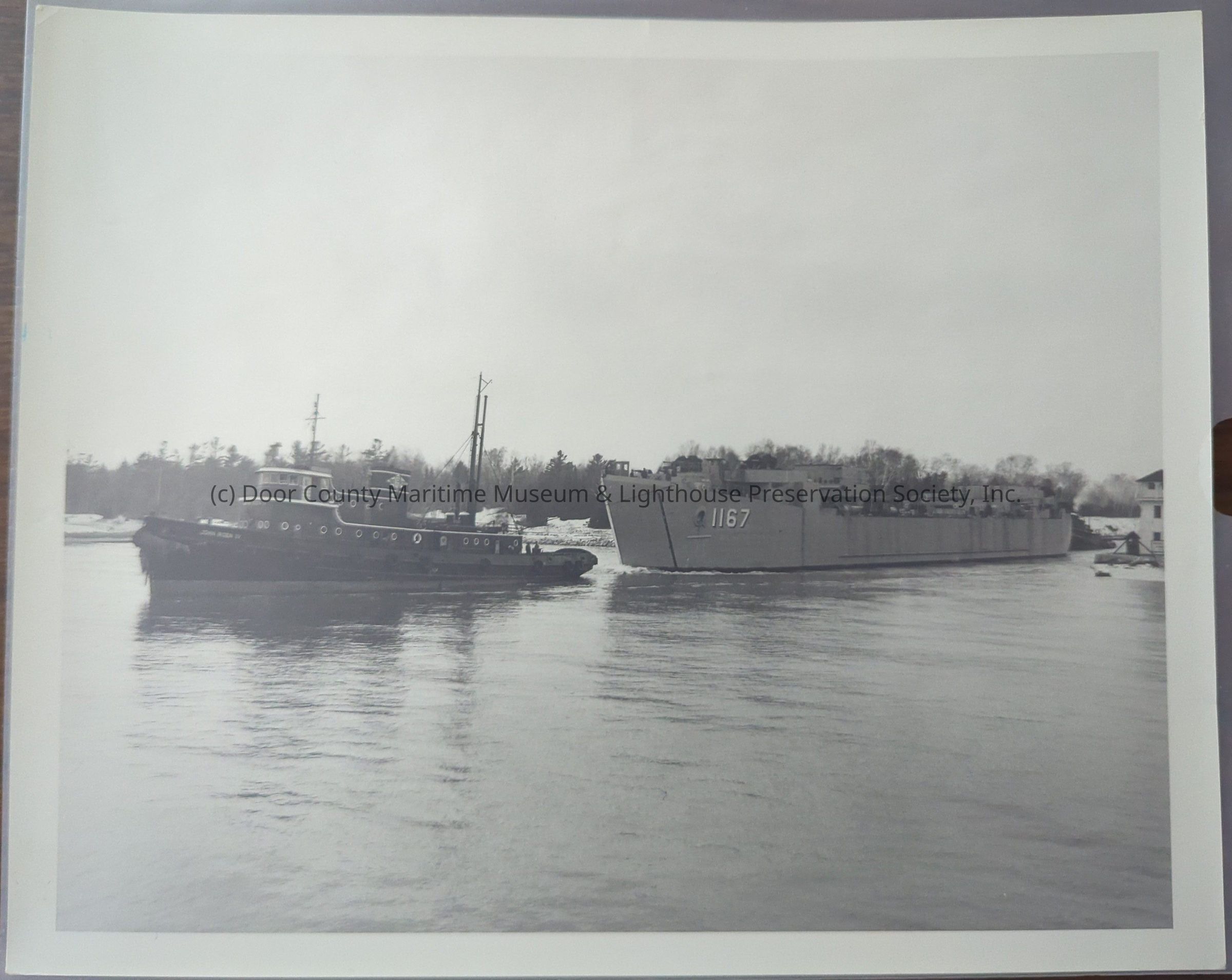 Colorless photograph. Depicts the tug boat "John Roen IV" pulling LST-1167 in the bay of Sturgeon Bay.Location