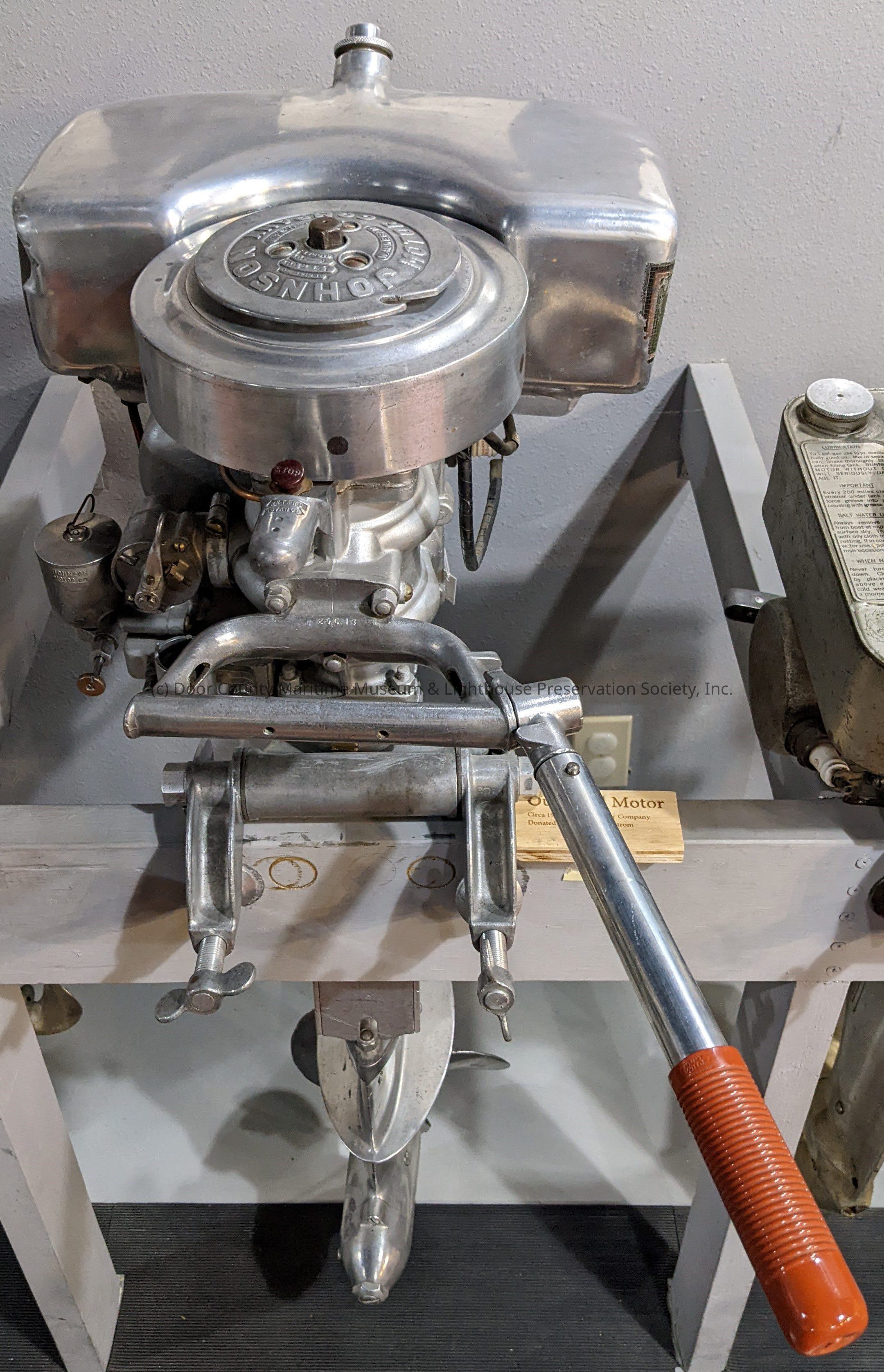 silver metal; red rubber handle grip; model K-50; serial number 144255; 8 hp; black connecting tubes for spark plugs; two copper tubes; three-blade propellerLocation