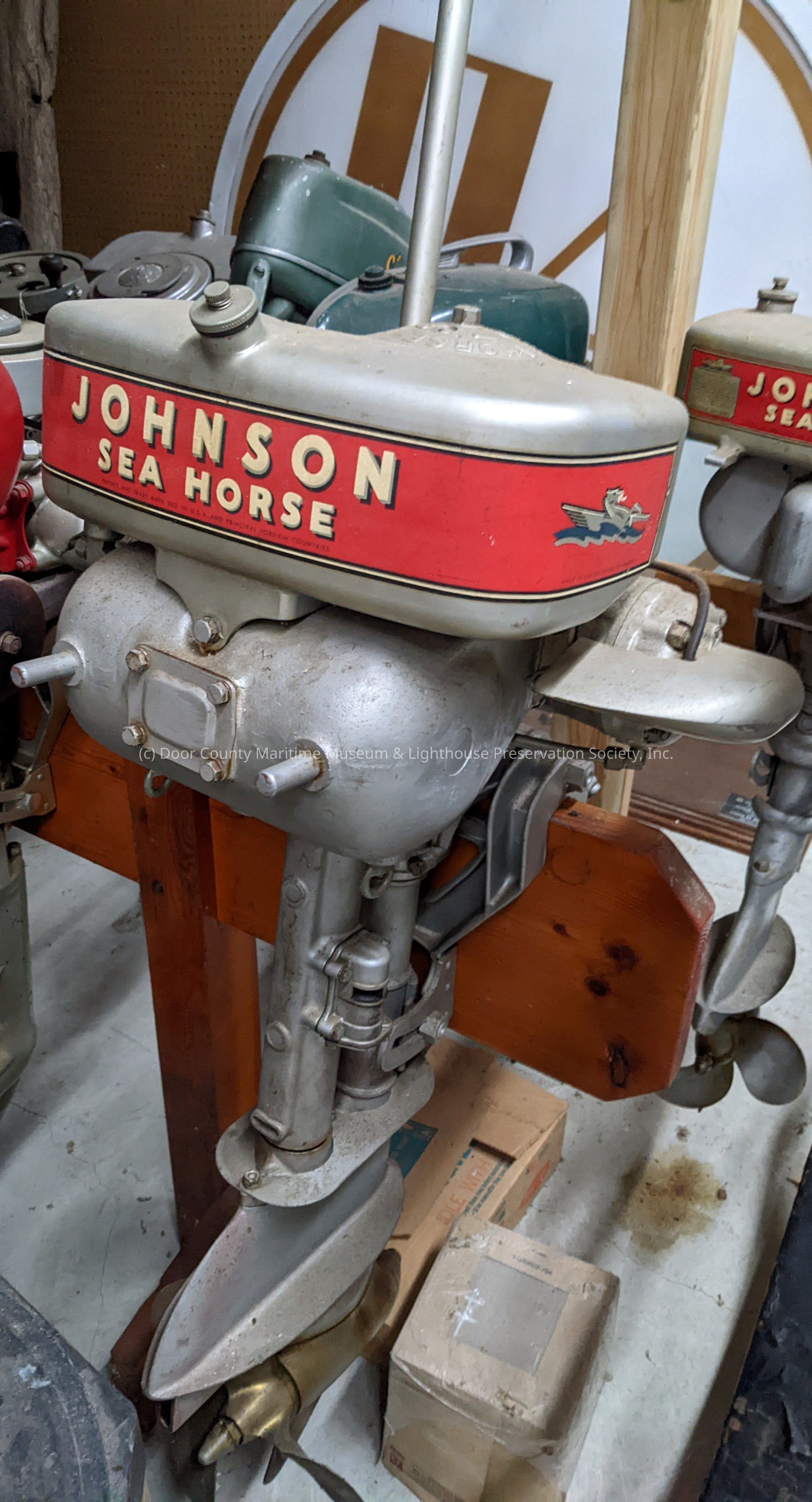 Silver metal in color. Red logo labels wraps around powerhead. Text on back of powerhead in white lettering.