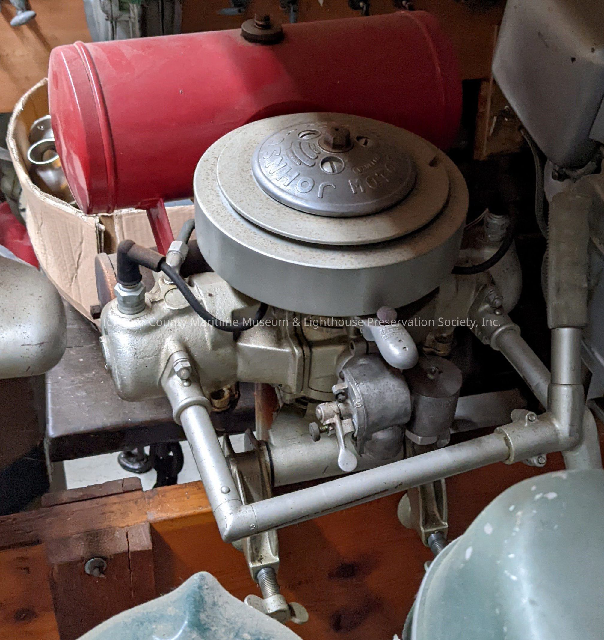 Silver metal outboard motor with red metal gas tank.