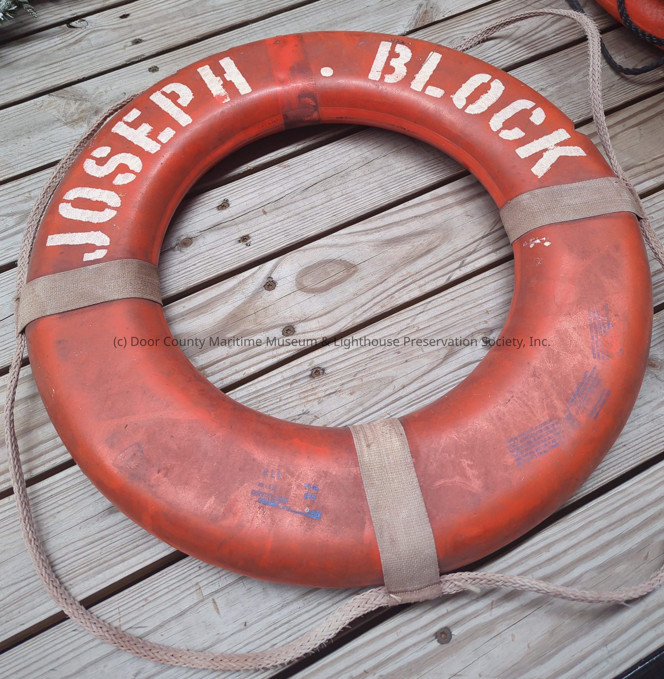 Orange foam life ring with the text "Joseph Block" in white print on front. White rope around circumference with three straps. One strap missing.